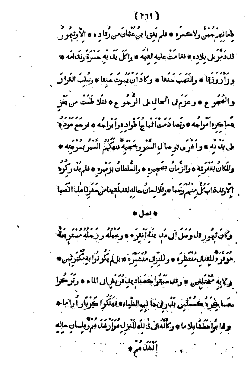 طعانهم جبن ولا كسرة فلم يفق ابن عثمان من رقاده، إلا وتيمور قد دمر على بلاده، فقامت عليه القيامة، وأكل يديه حسرة وندامة، وزأر وزقا، والتهب حنقا، وكاد أن يموت خنقا، وسلب القرار والهجوع، وعزم في الحال على الرجوع، فتلاطمت من بحر عساكر أمواجه، وتصادمت أثباج أطواده وأبراجه، فرجع عوده على بدئه، وأغرى بوصال السير وحجئه، فنهكهم السير بسرعته، والمكان بقفرته، والزمان بهجيره، والسلطان بزئيره، فلم يدركوه إلا وقد ذاب كل منهم وصبا، وتلا لسان حاله " لقد لقينا من سفرنا هذا نصبا " " فصل " وكان تيمور قد وصل إلى مدينة أنقرة، وخيله ورجله مستريحة موفرة، للقتال منتظرة، وللنزال متشمرة، بل لم يكونوا به مكترثين، ولا به محتفلين وقد سبقوا كصناديد قريش إلى الماء، وتركوا عساكره كمسلمي بدر في جانب الظماء، فهلكوا كرباً وأوما، وذابوا عطشاً بلا ماء، وكأنه إلى ذلك المنزل هو أرشدهم وبلسان حالهم أنشدهم