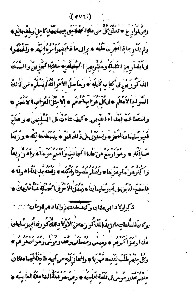 وكان للسلطان بايزيد المذكور، من الأولاد الذكور أمير سلمان هذا وهو أكبرهم، وعيسى ومصطفى ومحمد وموسى وهو أصغرهم، وكل منهم طلب لنفسه مهربا، وانحاز إليه من أبيه طائفة نجبا، فكان منهم محمد وموسى في قلعة أماسية، وهي خرشنة الشاهقة العاصية،