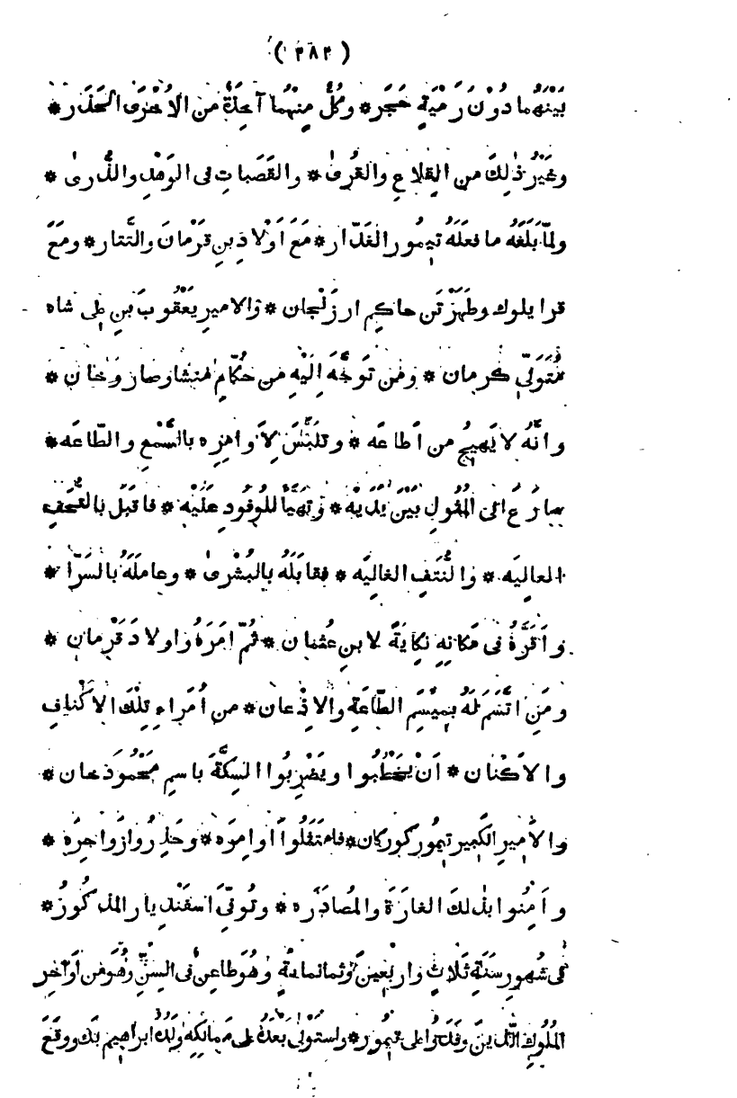 بينهما دون رمية حجر، وكل منها آخذة من الأخرى الحذر، وغير ذلك من القلاع والقرى، والقصبات في الوهد والذرا لما بلغه ما فعله تيمور الغدار، مع أولاد ابن قرمان والتتار، ومع قرايلوك وطرتهن حاكم أرزنجان، والأمير يعقوب بن علي شاه متولي كرمان، ومن توجه إليه من حكام منتشا وصاروخان، وأنه لا يهيج من أطاعه وتلبس لأوامره بالسمع والطاعة، سارع إلى المثول بين يديه، وتهيأ للوفود عليه، فأقبل بالتحف العالية، والنتف الغالية، فقابله بالبشرى، وعامله بالسرا، وأقره في مكانه، نكاية لابن عثمان، ثم أمره وأولاد قرمان، ومن اتسم له بميسم الطاعة والإذعان، من أمراء تلك الأكناف والأكنان، أن يخطبوا ويضربوا السكة باسم محمود خان، والأمير الكبير تيمور كوركان، فامتثلوا أوامره، وحذروا زواجره، وأمنوا بذلك الغارة والمصادرة " وتوفي إسفنديار المذكور في شهور سنة ثلاث وأربعين وثمانمائة، وهو طاعن في السن، وهو من أواخر الملوك الذين وفدوا على تيمور، واستولى بعده على ممالكه ولده إبراهيم بك ووقع
