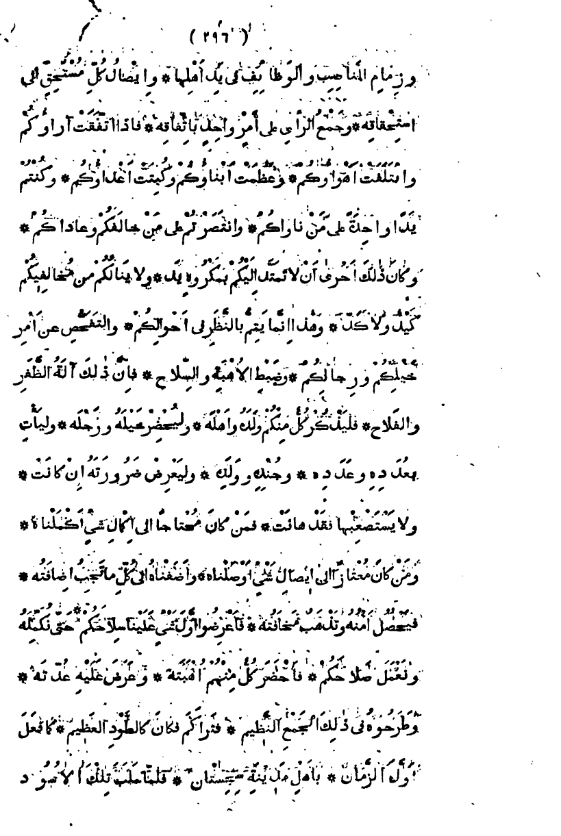 وأما أنا فلست منكم بدان، ولا لي في المدافعة عنكم يدان، فلابد لعقد أمركم من نظام، ولصلاة جماعتكم من شرائط وأركان يجب القيام بها أولاً والسلام وأول شرائط ذلك إمام، يرجع إلى الاقتداء، بأفعاله الخواص والعوام، ثم بعد ذلك ترتيب الجماعة، وتنزيل كل واحد في صف السمع والطاعة، ثم وضع الأشياء في محلها،