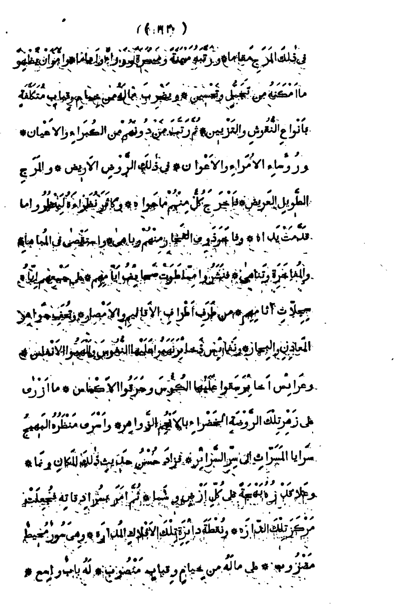 في ذلك المرج مقاماً، ورتبه ميمنة وميسرة ووراء وأماماً، وأمر أن يظهر " كل " ما أمكنه من تجمل وتحسين، ويضرب ماله من خيام وقباب متكلفة بأنواع النقوش والتزيين ثم رتب من دونهم من الكبراء والأعيان، ورؤساء الأمراء والأعوان في ذلك الروض الأريض، والمرج الطويل العريض، فأخرج كل منهم ما حواه، وكاثر نظراءه لينظروا ما قدمت يداه، وفاخر ذوي الفخار منهم وباهى، واستقصى في المباهاة والمفاخرة وتناهى، فنشروا مما طوت صحائف أيامهم، على جمعهم إياه سجلات آثامهم، من طرف أطراف الأقاليم والأمصار، وتحف جواهر المعادن والبحار، ونفائس ذخائر نهبوا عليها النفوس وألهبوا الأنفاس، وعرائس أخاير سقوا عليها الكؤس وخرقوا الأكياس، ما أزرى على زهر تلك الروضة الخضراء بالأنجم الزواهر، وأسرى منظره البهيج سرايا المسرات إلى سر السرائر، فزاد حسن حديث ذلك المكان ونما، وعلا قدره بهجة على كل أرض وسما ثم أمر بسرادقاته فجعلت مركز تلك الدارة، ونقطة دائرة تلك الأفلاك المدارة، وهي سور محيط مضروب، على ماله من خيام وقباب منصوب، له باب واسع،