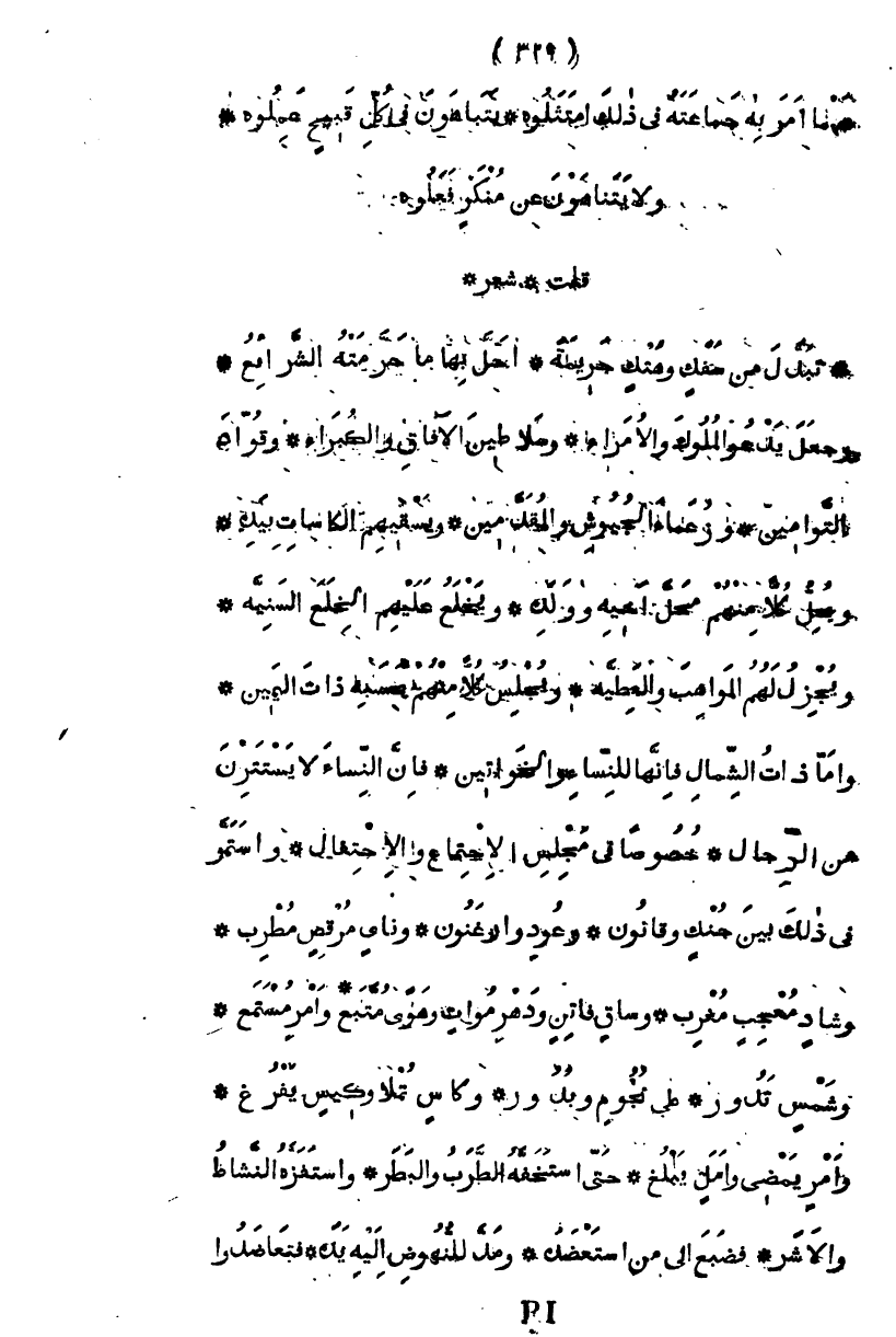 واستمر في ذلك بين جنك وقانون، وعود وأرغنون، وناي مرقص مطرب، وشاد معجب مغرب، وساق فاتن، ودهر موات، وهوى متبع، وأمر مستمع، وشمس تدور، على نجوم وبدور، وكأس تملأ وكيس يفرغ، وأمر يمضي وأمل يبلغ، حتى استخفه الطرب والبطر، واستفزه النشاط والأشر، فضبع إلى من استعضده، ومد للنهوض إليه يده، فتعاضدوا