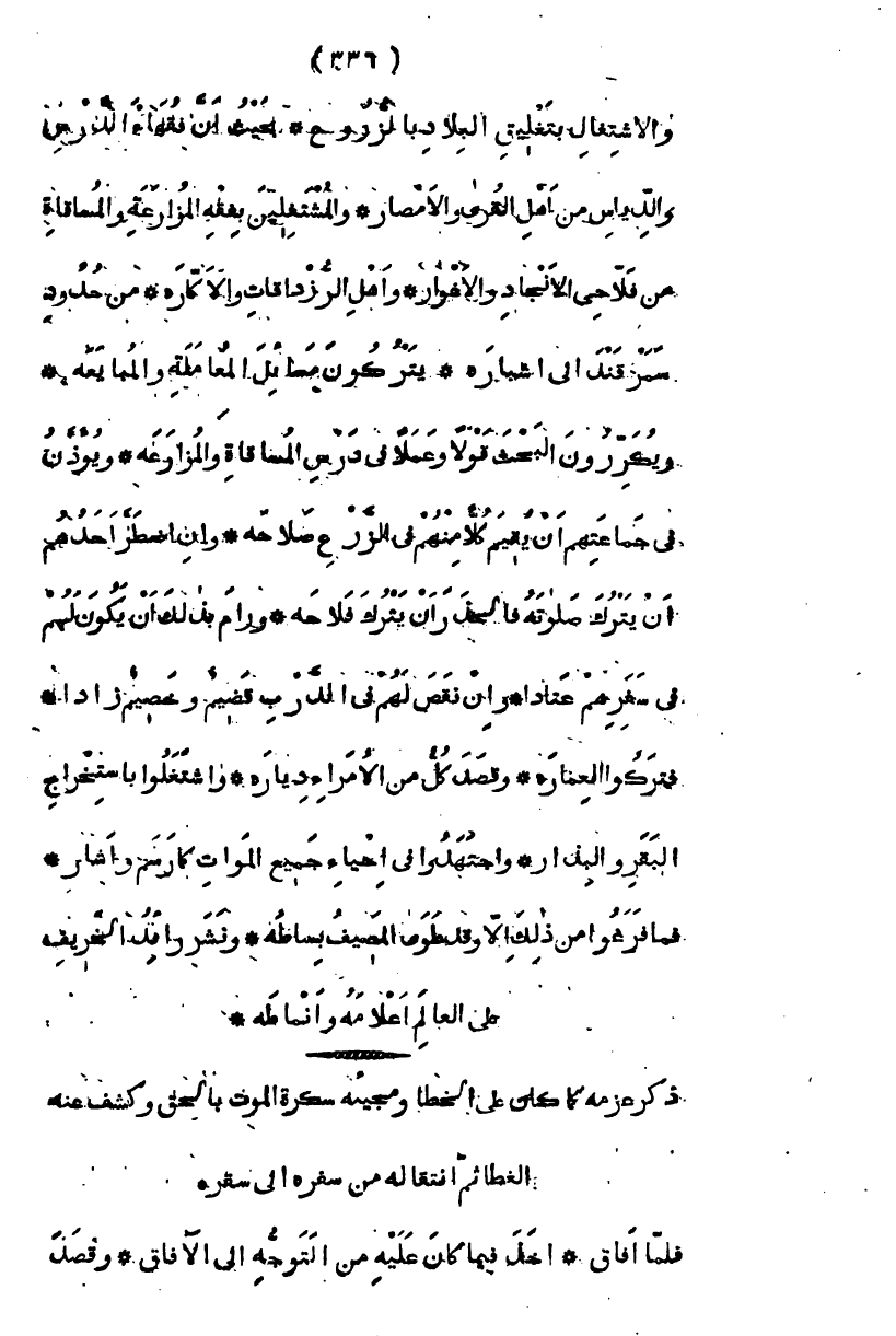 والاشتغال بتعليق البلاد بالزروع، بحيث أن فقهاء الدرس والدياس، من أهل القرى والأمصار، والمشتغلين بفقه المزارعة والمساقاة من فلاحي الأنجاد والأغوار، وأهل الرزداقات والأكارة، من حدود سمرقند إلى أشبارة، يتركون مسائل المعاملة والمبايعة، ويكررون البحث قولاً وعملاً في درس المساقاة والمزارعة ويؤذنون في جماعتهم أن يقيم كل منهم في الزرع صلاحه، وإن اضطر أحدهم أن يترك صلاته فالحذر الحذر أن يترك فلاحه، ورام بذلك أن يكون لهم في سفرهم عتادا، وإن نقص لهم في الدرب قضيم وخضيم زادا، فتركوا العمارة، وقصد كل من الأمراء دياره، واشتغلوا باستخراج البقر والبذار، واجتهدوا في إحياء جميع الموات كما رسم وأشار، فما فرغوا من ذلك إلا وقد طوى المصيف بساطه، ونشر رائد الخريف على العالم أعلامه وأنماطه