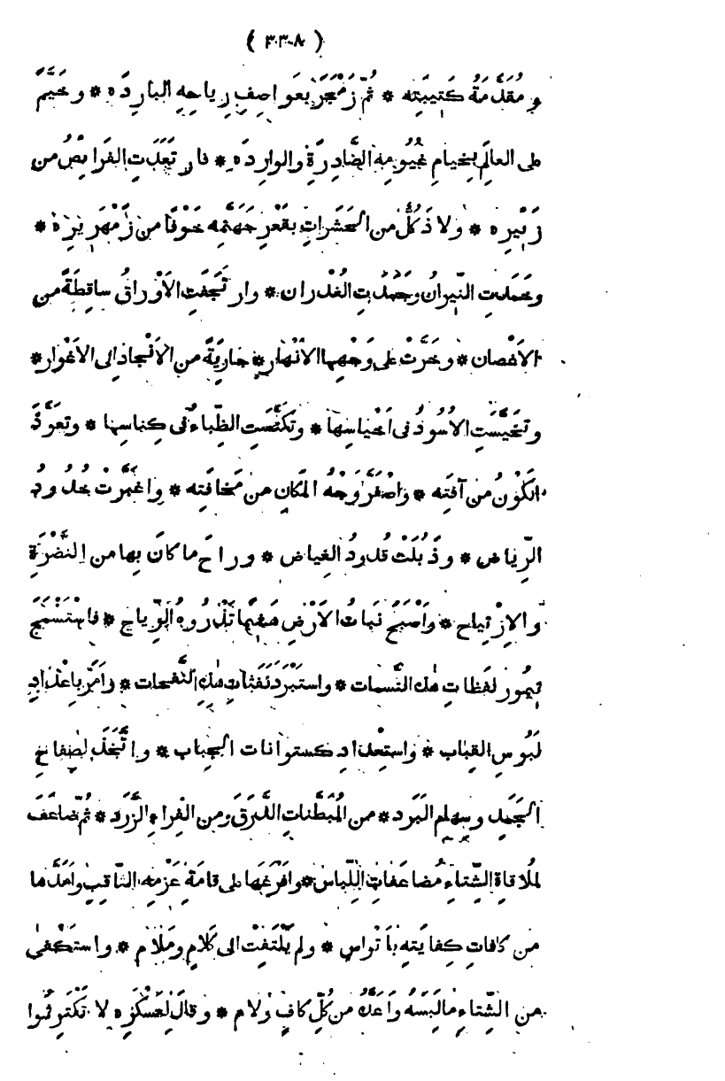 ومقدمة كتيبته ثم زمجر بعواصف رياحه الباردة، وخيم على العالم بخيام غيومه الصادرة والواردة، فارتعدت الفرائص من زئيره، ولاذ كل من الحشرات بقعر جهنمه خوفاً من زمهريره، وخمدت النيران وجمدت الغدران، وارتجفت الأوراق ساقطة من الأغصان، وخرت على وجهها الأنهار، جارية من الأنجاد إلى الأغوار، وتخيست الأسود في أخياسها، وتكنست الظباء في كناسها، وتعوذ الكون من آفته، واصفر وجه المكان من مخافته، واغبرت خدود الرياض، وذبلت قدود الغياض، وراح ما كان بها من النضرة والارتياح، وأصبح نبات الأرض هشيماً تذروه الرياح فاستسمج تيمور لقطات هذه النسمات، واستبرد نفثات هذه النفحات، وأمر بإعداد لبوس القباب، واستعداد بركستوانات الجباب، واتخذ لصفاح الجمد وسهام البرد، من المبطنات الدرق ومن الفراء الزرد، ثم ضاعف لملاقاة الشتاء مضاعفات اللباس وأفرغها على قامة عزمه الثاقب وأمدها من كافات كفايته بأتراس، ولم يلتفت إلى كلام وملام، واستكفى من الشتاء بما لبسه وأعده من كل كاف ولام، وقال لعسكره لا تكترثوا