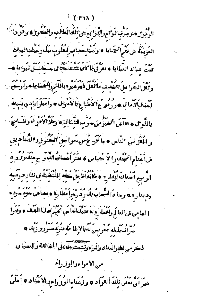 الرموز، وصرف الموانع والتوابع عن تلك المطالب والكنوز، وقوى العزيمة على فتح الخبايا وصيد عصافير القلوب ببذر حبات الهبات تحت شباك العطايا، ففرق ما كان شتت جده في جمعه شمل البرايا، وثقل الكواهل بتخفيف ما أثقل ظهر غيره بالمآثم والخطايا، وأوسق أحمال الآمال، وربوع الأطماع بالأموال وأمطر أيادي يمينه بالنوال ففاض الخير من صوب الشمال، وملأ الأفواه والمسامع والمقل من الناس، بما أفرغ من حواصل الكنوز والصناديق على أغتام الجند والأكياس، فنثر أغصان الدوح عند ورود الربيع أصناف أزهاره، فكأنه أنامل كفه المنتظمة في نثار درهمه وديناره، وجاد السحاب بدردره وأمطاره، فضاهى جود جوده الهامي على العالم وأقطاره، فقيد الناس كلهم بهذا القيد، ونحوا صراف بذله معربين له بالإطاعة فترك عمر ويزيد