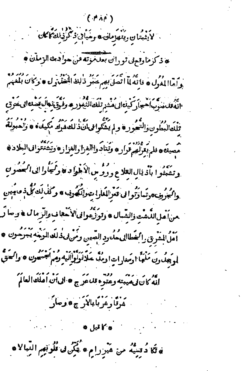 وأما المغول، فإنه لما اتصل بهم خبر وفاة ذلك المخذول، وكان بلغهم أنه صوب أحجار كيده إلى هشم تلك الثغور، وفوق نبال قصده إلى خرق تلك البطون والنحور، لم يشكوا في أن ذلك شرك مكيدة، وأحبولة مصيدة، فلم يقر لهم قرار، وتنادوا الفرار الفرار، وتشتتوا في البلاد، وتشبثوا بأذيال القلاع ورؤوس الأطواد، ولجئوا إلى الحصون والجروف، وتماوتوا في قعر المغارات والكهوف، وكذلك كل ذي يمين من أهل الدشت والشمال، وتوزعوا في الأحقاف والرمال، وصار أهل المشرق والخطا وإلى حدود الصين ومن في ذلك الوجه يسرحون " لو يجدون ملجأ أو مغارات أو مدخلاً لولوا إليه وهم يجمحون " والحق أنه كان في هيبته وعتوه، وقد عرج إلى أن أهلك العالم شرقاً وغرباً بالأرج، وصار كما قيل