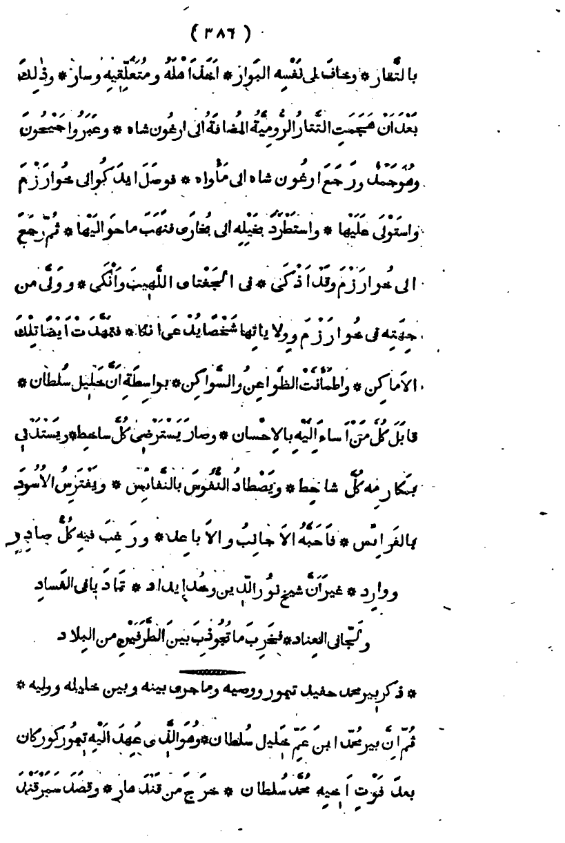 بالتتار، وخاف على نفسه البوار، أخذ أهله ومتعلقيه وسار، وذلك بعد أن هجمت التتار الرومية المضافة إلى أرغون شاه، وعبروا جيحون وهو جمد ورجع أرغون شاه إلى مأواه، فوصل إيدكو إلى خوارزم واستولى عليها، واستطرد بخيله بخارى فنهب ما حواليها ثم رجع إلى خوارزم وقد أذكى في الجغتاي اللهيب، وأنكى وولى من جهته في خوارزم وولاياتها شخصاً يدعى آنكا، فتمهدت أيضاً تلك الأماكن، واطمأنت الظواعن والسواكن، بواسطة أن خليل سلطان، قابل كل من أساء إليه بالإحسان، وصار يسترضي كل ساخط، ويستدني بمكارمه كل شاحط، ويصطاد النفوس بالنفائس، ويفترس الأسود بالفوارس، فأحبه الأجانب والأباعد، ورغب فيه كل صادر ووارد، غير أن شيخ نور الدين، وخدايداد، تماديا في الفساد، ولجا في العناد، وخربا ما تجوذب بين الطرفين من البلاد