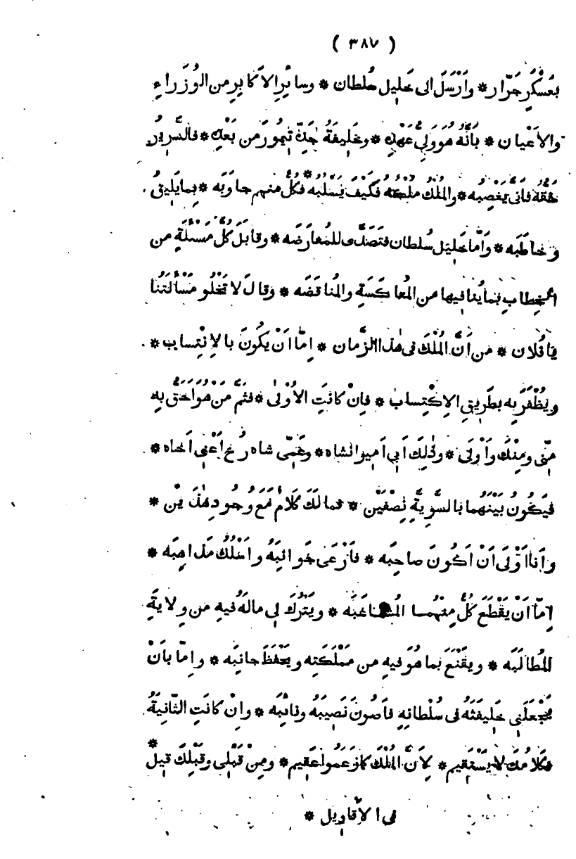 بعسكر جرار وأرسل إلى خليل سلطان، وسائر الأكابر من الوزراء والأعيان، بأنه هو ولي العهد، وخليفة جده تيمور من بعده، والسرير حقه فأنى يغصبه؟ والملك ملكة فكيف يسلبه؟ فكل منهم جاوبه، بما يليق بما خاطبه وأما خليل سلطان فتصدى للمعارضة، وقابل كل مسألة من الخطاب بما ينافيها من المعاكسة والمناقضة، وقال لا تخلو مسألتنا يا فلان، من أن الملك في هذا الزمان، إما أن يكون بالانتساب، أو يظفر به بطريق الاكتساب، فإن كانت الأولى، فثم من هو أحق به مني ومنك وأولى، وذلك أبي أميران شاه، وعمي شاه رخ أعني أخاه، فيكون بينهما بالسوية نصفين، فما لك كلام مع وجود هذين، وأنا أولى أن أكون صاحبه، فأرعى جوانبه، وأسلك مذاهبه، إما بأن يقطع كل منهما عنى المشاغبة، ويترك لي ماله فيه ولاية المطالبة، ويقنع بما هو فيه من مملكته ويحفظ جانبه، وإما بأن يجعلني خليفته في سلطانه فأصون نصيبه ونائبه، وإن كانت الثانية فكلامك لا يستقيم، لأن الملك كما زعموا عقيم، ومن قبلي وقبلك قيل، في الأقاويل