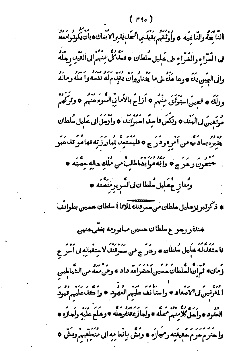 النائحة والناعية، وأوثقهم بقيدي الحديد والأيمان، أن يكونوا معه في السراء والضراء على خليل سلطان، فمد كل منهم إلى القيد رجله وإلى اليمين يده، وعاهده على ما يختار وأن يقدم له نفسه وأهله وماله وولده، فحين استوثق منهم، أزاح بالأماني السوء عنهم، وتركهم موثقين في البند، ونكص قاصداً سمرقند، وأرسل إلى خليل سلطان يخبره بما دب من أمره ودرج، فليستعد لمبارزته فهاهو قد عبر جيحون وخرج، وأنه هو أيضاً طالب من ملك خاله حصته ومنازع خليل سلطان في السرير منصته