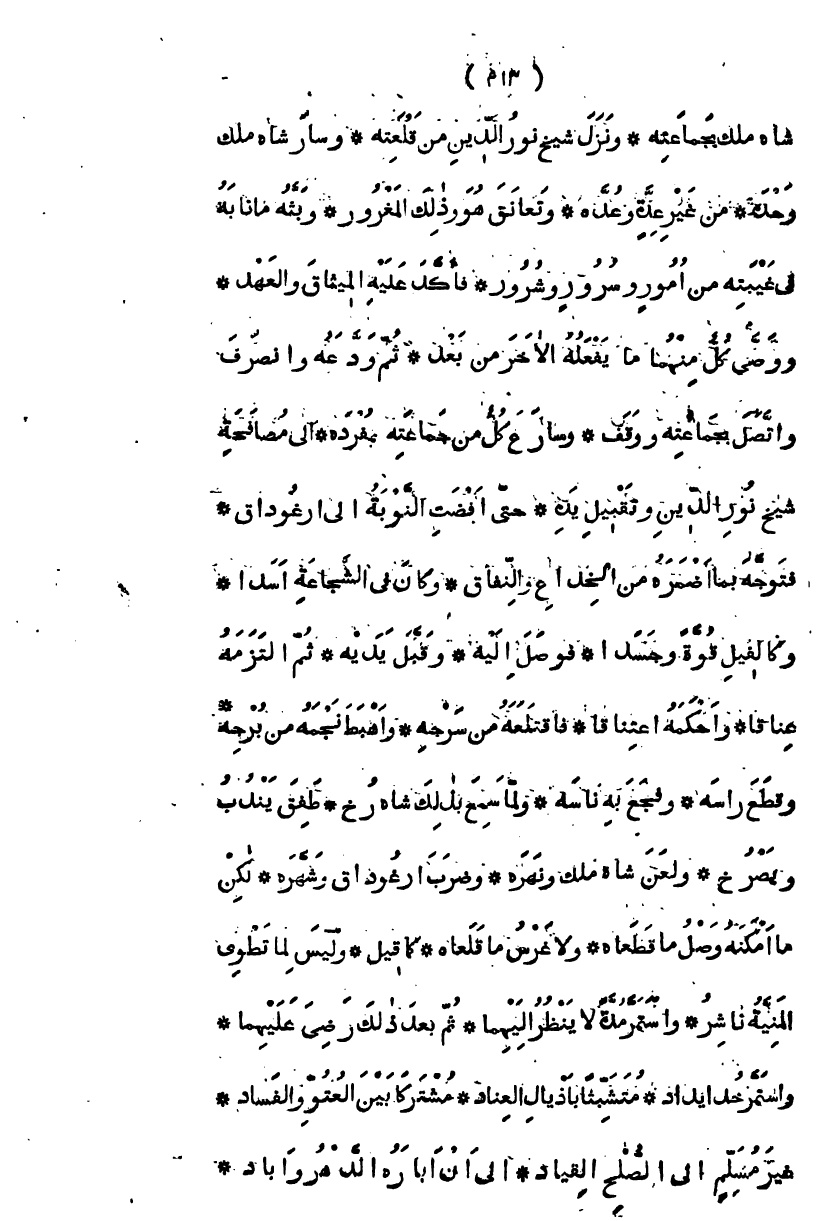 وكان في الشجاعة أسداً، وكالفيل قوة وجسدا، فوصل إليه، وقبل يديه، ثم التزمه عناقا، وأحكمه اعتناقا، فاقتلعه من سرجه، وأهبط نجمه من برجه، وقطع رأسه، وفجع به ناسه ولما سمع بذلك شاه رخ طفق يندب ويصرخ، ولعن شاه ملك ونهره، وضرب أرغوداق وشهره، لكن ما أمكنه وصل ما قطعاه، ولا غرس ما قلعاه، كما قيل