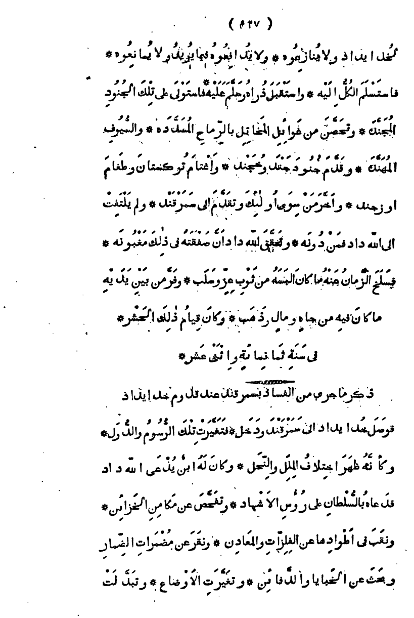 فوصل خدايداد إلى سمرقند ودخل، فتغيرت تلك الرسوم والدول، وكأنه ظهر اختلاف الملل والنحل، وكان له ابن عم يدعى ألله داد، فدعاه بالسلطان على رءوس الأشهاد، وتفحص عن مكامن الخزائن، ونقب في أطوادها عن الفلزات والمعادن، ونقر عن مضمرات الضمار وبحث عن الخبايا والدفائن، وتغيرت الأوضاع، وتبدلت