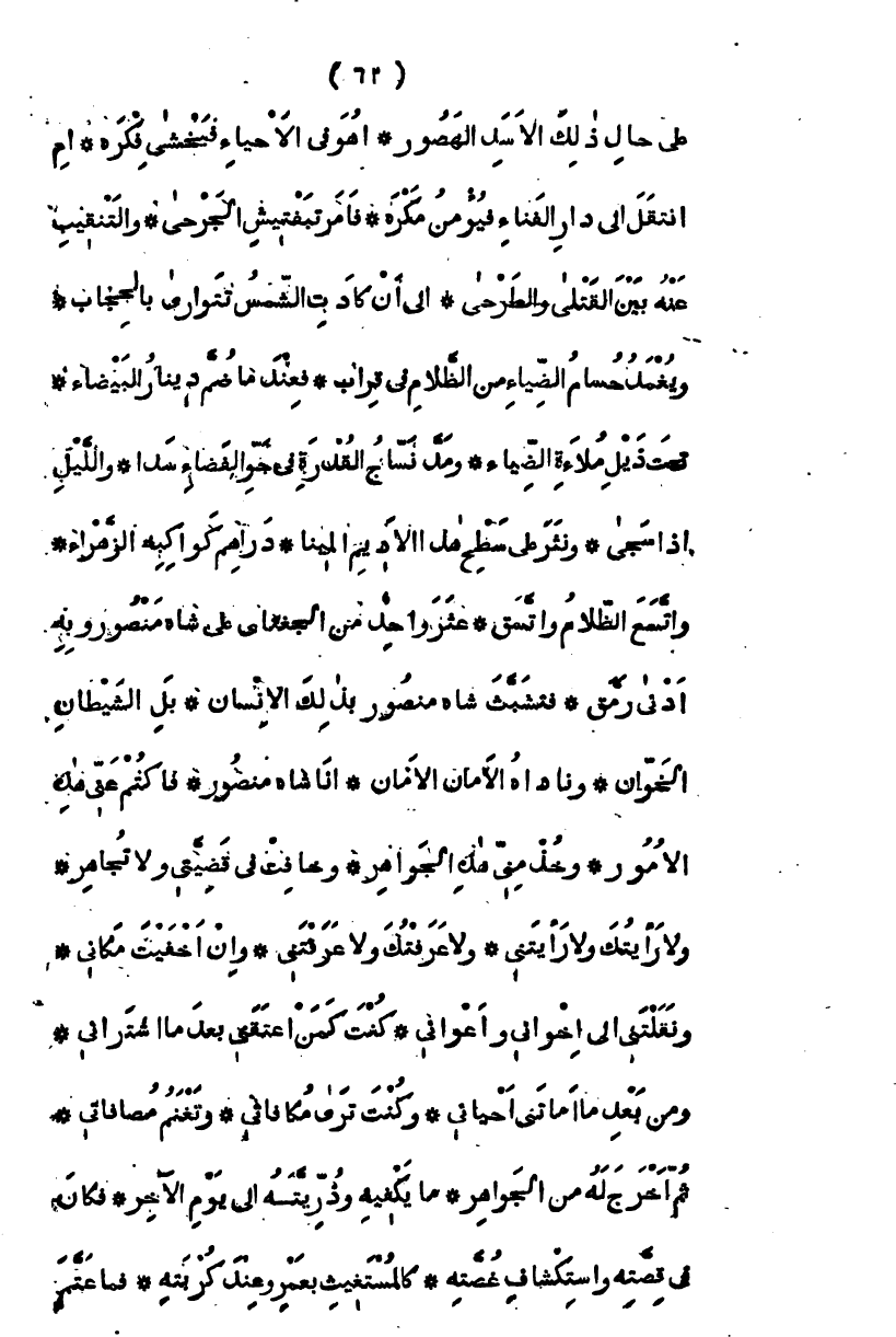 على حال ذلك الأسد الهصور، أهو في الأحياء فيخشى فكره، أم انتقل إلى دار الفناء فيؤمن مكره، فأمر بتفتيش الجرحى، والتنقيب عنه بين القتلى والطرحى، إلى أن كادت الشمس تتوارى بالحجاب، ويغمد حسام الضياء من الظلام في قراب، فعندما ضم دينار البيضاء، تحت ذيل ملاءة الضياء، ومد نساج القدرة في جو الفضاء سدى، والليل إذا سجى ونثر على سطح هذا الأديم المسا دراهم كواكبه الزهراء، واتسع الظلام واتسق، عثر واحد من الجغتاي على شاه منصور وبه أدنى رمق، فتشبث شاه منصور بذلك الإنسان، بل الشيطان الخوان، وناداه الأمان الأمان أنا شاه منصور فاكتم عني هذه الأمور وخذ مني هذه الجواهر وخافت في قضيتي ولا تجاهر، ولا رأيتك ولا رأيتني، ولا عرفتك ولا عرفتني، وإن أخفيت مكاني ونقلتني إلى إخواني وأعواني، كنت كمن أعتقني بعدما اشتراني، ومن بعد ما أماتني أحياني، وكنت ترى مكافأتي، وتغنم مصافاتي، ثم أخرج له من الجواهر، ما يكفيه وذريته إلى يوم الآخر فكأن في قصته واستكشاف غصته كالمستغيث بعمرو عند كربته فما عتم