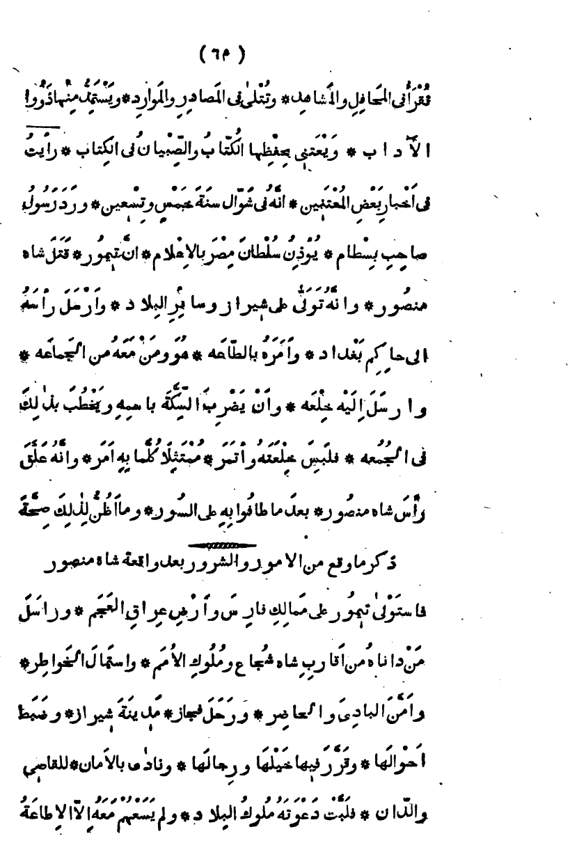 تقرأ في المحافل والمشاهد، وتتلى في المصادر والموارد ويستمد منها ذوو الأدب، ويعني بحفظها الكتاب والصبيان في الكتاب " رأيت " في أخبار بعض المعتنين، أنه في شوال سنة خمس وتسعين، ورد رسول صاحب بسطام، يؤذن سلطان مصر بالإعلام، أن تيمور قتل شاه منصور واستولى على شيراز وسائر البلاد، وأرسل رأسه إلى حاكم بغداد، وأمره بالطاعة، هو ومن معه من الجماعة، وأرسل إليه خلعة، وأن يضرب السكة باسمه ويخطب بذلك في الجمعة، فلبس خلعته وائتمر ممتثلاً كل ما به أمر وأنه علق رأس شاه منصور، بعدما طافوا به على السور، وما أظن لذلك صحة