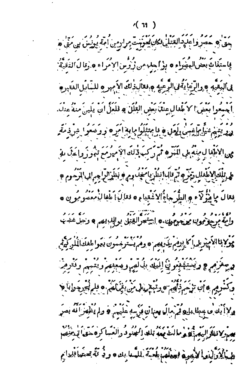 حتاً، حصروا عدد القتلى فكانوا نحو ست مرات من أمة يونس بن متى، فاستغاث بعض البصراء، بواحد من رؤوس الأمراء، وقال البقية في البقية، والرعاية في الرعية، فقال ذلك الأمير للسائل الفقير اجمعوا بعض الأطفال عند بعض القلل، فلعل أن نلين منه عند رؤيتهم شيئاً ما عسى ولعل، فامتثلوا ما به أمر، ووضعوا شرذمة من الأطفال منه على الممر