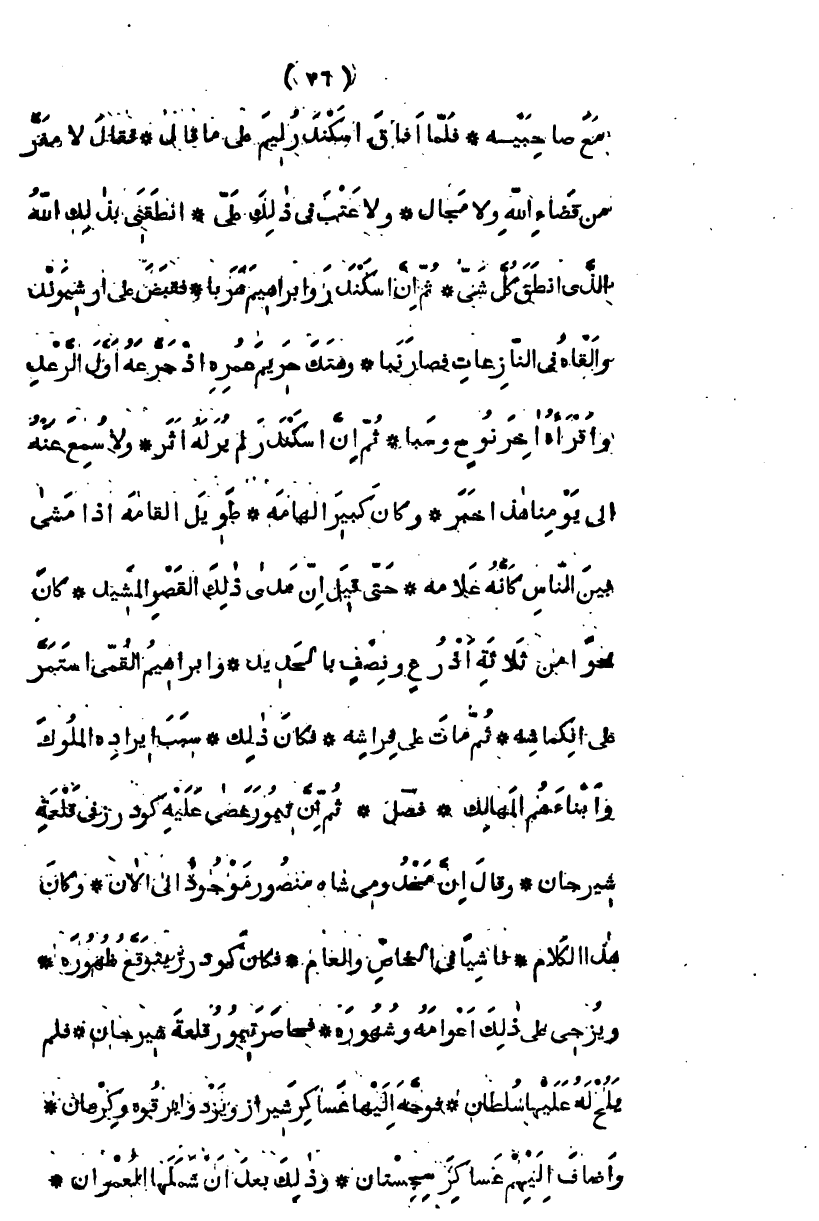 مع صاحبيه، فلما أفاق اسكندر، ليتم ما قال، فقال لا مفر من قضاء الله ولا مجال، ولا عتب في ذلك علي، أنطقني بذلك الله الذي أنطق كل شيء ثم إن اسكندر وإبراهيم هربا، فقبض على أرشيوند وألقاه في النازعات فصار نبأ، وهتك حريم عمره إذ جرعه أول الرعد فأقرأه آخر نوح وسبأ، ثم إن اسكندر لم ير له أثر، ولا سمع عنه إلى يومنا هذا خبر وكان كبير الهامة، طويل القامة، إذا مشى بين الناس كأنه علامة، حتى قيل أن يدي ذلك القصر المشيد كان نحواً من ثلاثة أذرع ونصف بالحديد، وإبراهيم القمي استمر على انكماشه، ثم مات على فراشه، فكان ذلك سبب إيراده الملوك وأبناءهم المهالك " فصل " ثم أن تيمور عصى عليه كودرز في قلعة سيرجان، وقال إن مخدومي شاه منصور موجود إلى الآن، وكان هذا الكلام فاشياً في الخاص والعام، فكان كودرز يتوقع ظهوره، ويزجي على ذلك أعوامه وشهوره فحاصر تيمور قلعة سيرجان، فلم يلح له عليها سلطان، فوجه إليها عساكر شيراز ويزد وأبرقوه وكرمان، وأضاف إليهم عساكر سجستان، وذلك بعد أن شملها العمران،