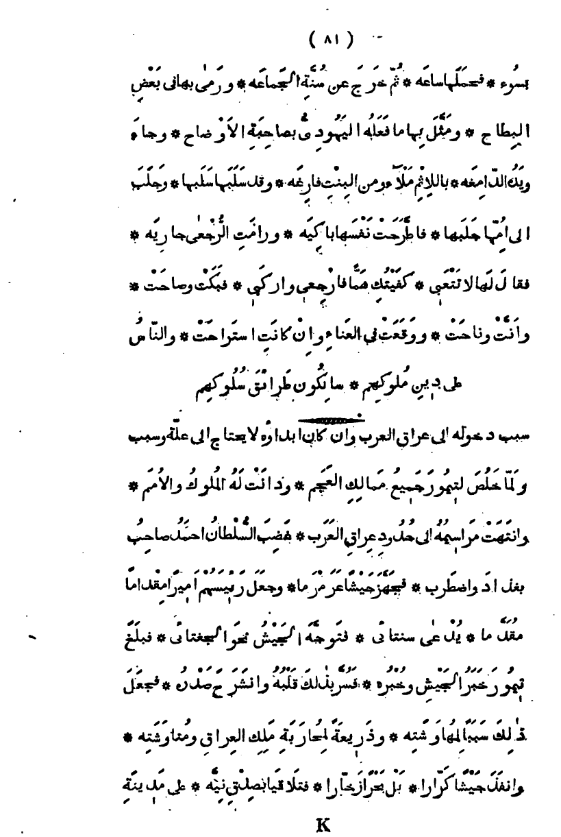 بسوء، فحملها ساعة ثم خرج عن سنة الجماعة، ورمى بها في بعض البطاح وفعل بها ما فعله اليهودي بصاحبه الأوضاح وجاء ويده الدامغة، في الإثم ملأى ومن البنت فارغة، وقد سلبها سلبها، وجلب إلى أمها جلبها، فاطرحت نفسها باكية، ورامت الرجعى جارية، فقال لها لا تتعبي، كفيتك همها فارجعي واركبي، فبكت وصاحت، وأنت وناحت، ووقعت في العناء وإن كانت قد استراحت، والناس على دين ملوكهم، سالكون طرائق سلوكهم