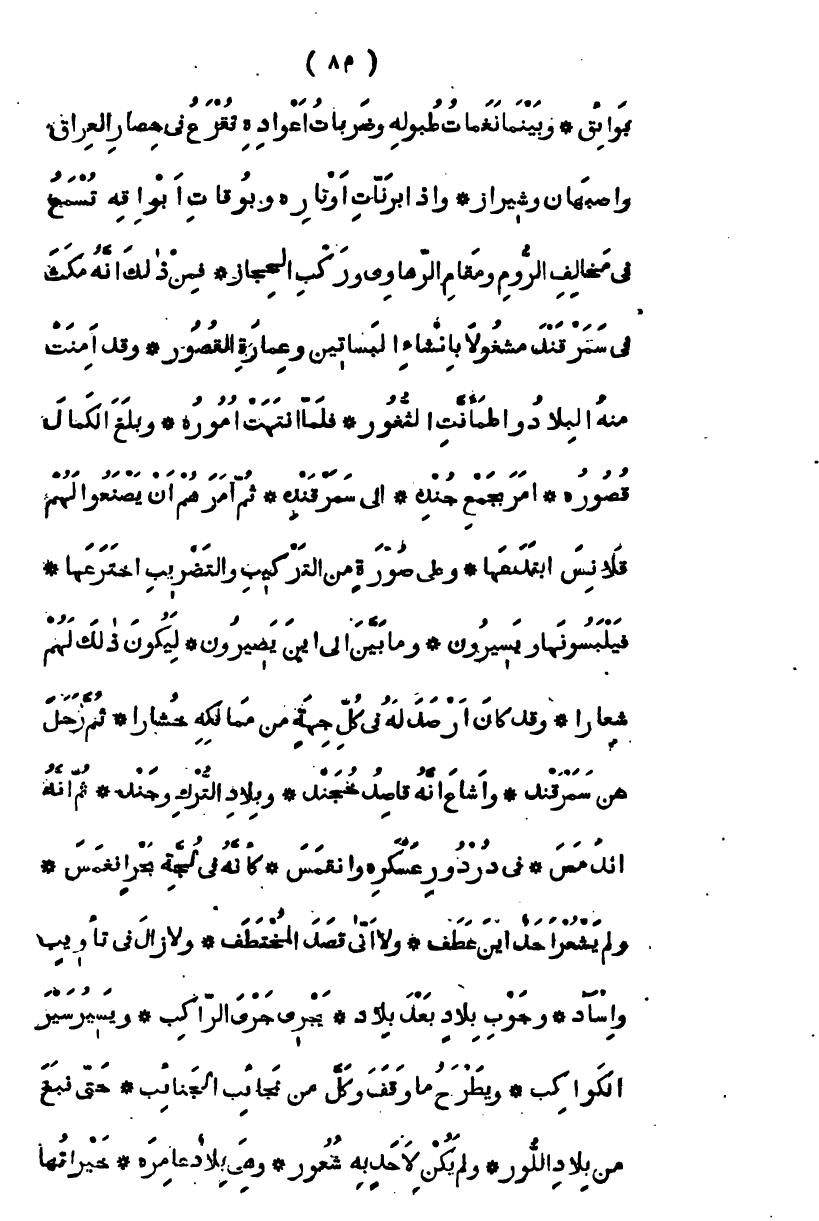بوائق، وبينما نغمات طبوله وضربات أعواده تقرع في حصار العراق وأصبهان وشيراز، وإذا برنات أوتاره وبوقات أبواقه تسمع في مخالف الروم ومقام الرهاوي وركب الحجاز فمن ذلك أنه مكث في سمرقند مشغولاً بإنشاء البساتين وعمارة القصور، وقد أمنت منه البلاد واطمأنت الثغور، فلما انتهت أموره وبلغ الكمال قصوره، أمر بجمع جنده، إلى سمرقنده، ثم أمرهم أن يصنعوا لهم قلانس ابتدعها، وعلى صورة من التركيب والتضريب اخترعها، فيلبسونها ويسيرون، وما بين إلى أين يصيرون، ليكون ذلك لهم شعاراً، وقد كان أرصد له في كل جهة من مماليكه جشاراً، ثم رحل عن سمرقند، وأشاع أنه قاصد خجند، وبلاد الترك وجند ثم إنه اندمس في دردور عسكره وإنقمس، كأنه في لجة بحر انغمس، ولم يشعر أحد أين عطف، ولا أنى قصد المختطف، ولا زال في تأويب وآساد، وجوب بلاد بعد بلاد، يسر سير الكواكب، ويجري جري المراكب ويطرح ما وقفه وكل من نجائب الجنائب، حتى نبع من بلاد اللور، ولم يكن لأحد به شعور، وهي بلاد عامرة، خيراتها