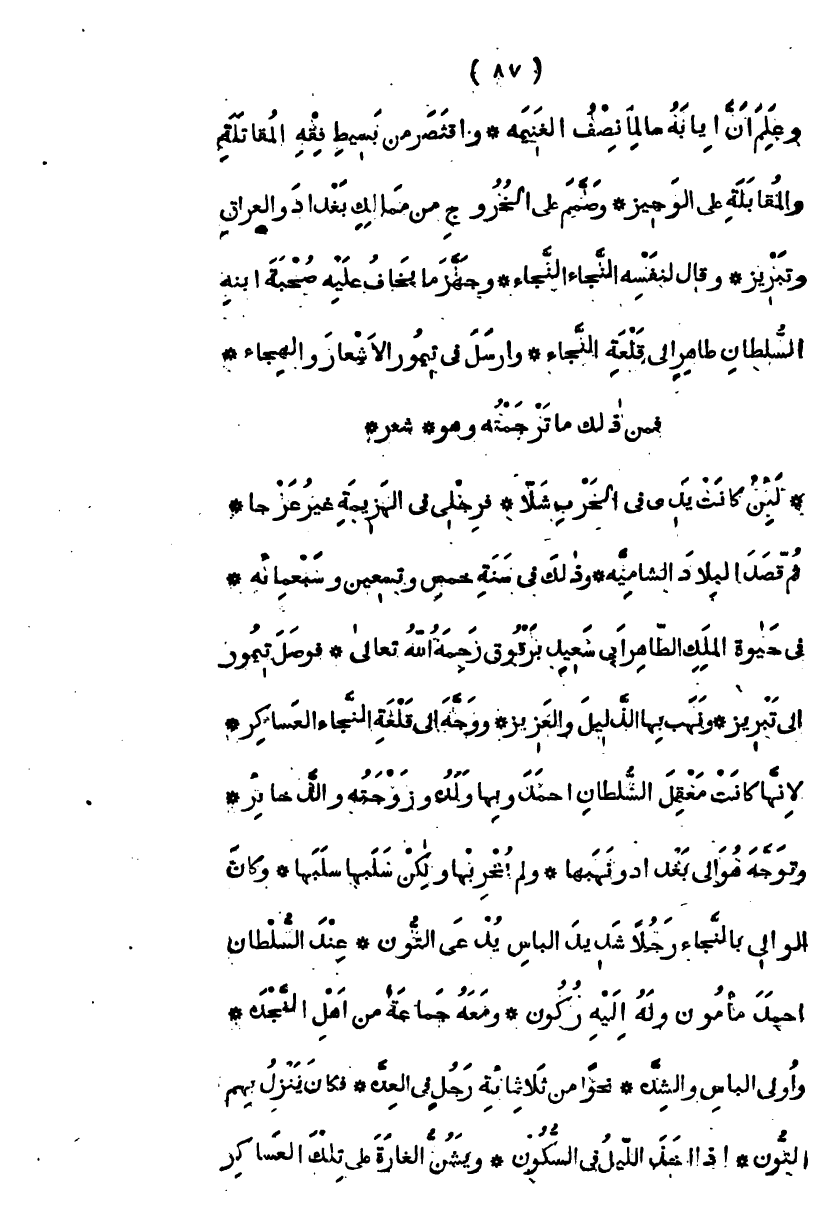 وعلم أن إيابه سالماً نصف الغنيمة، واقتصر من بسيط فقه المقاتلة والمقابلة على الوجيز، وصمم على الخروج من ممالك بغداد والعراق وتبريز وقال لنفسه النجاء النجاء وجهز ما يخاف عليه صحبة ابنه السلطان طاهر إلى قلعة النجا، وأرسل إلى تيمور الأشعار والهجاء، فمن ذلك ما ترجمته فقلت