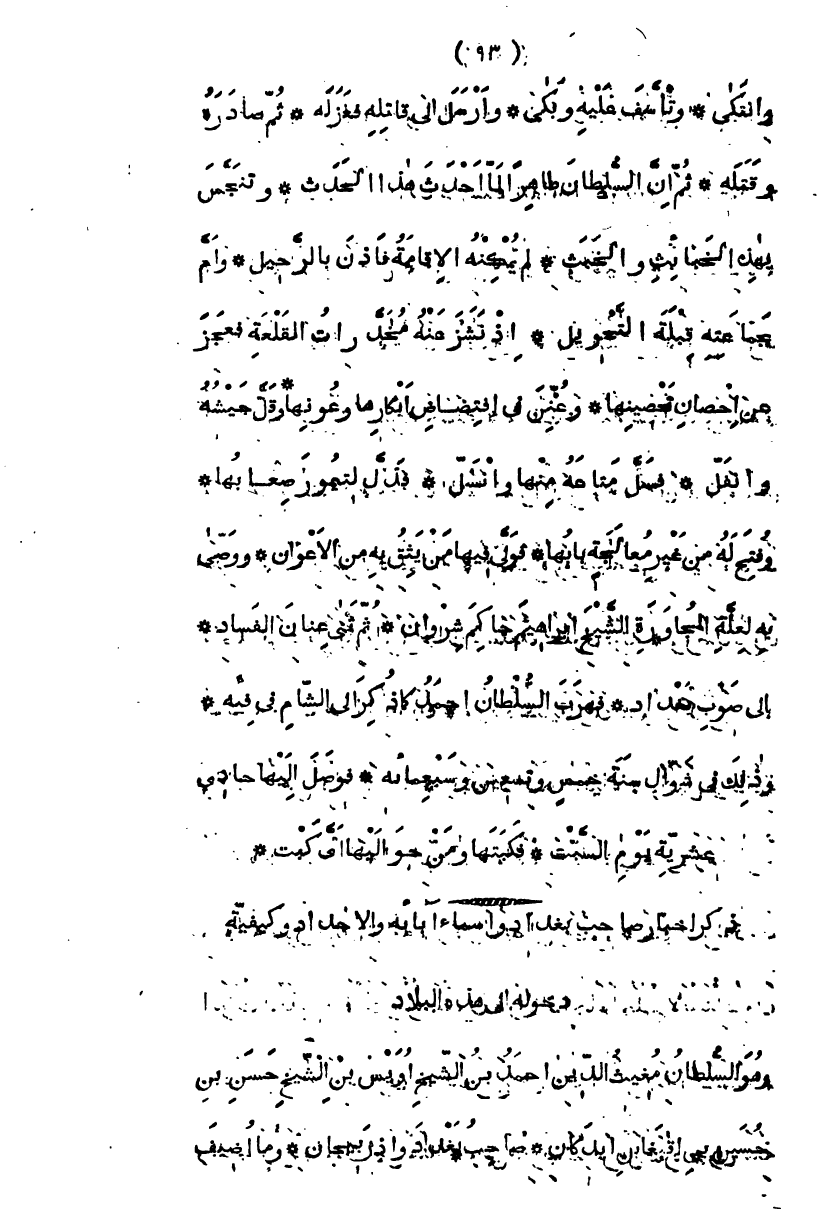 ثم أن السلطان طاهر لما أحدث هذا الحدث وتنجس بهذه الخبائث والخبث لم يمكنه الإقامة فأذن بالرحيل، وأم بجماعته قبل التحويل، إذ نشز عنه مخدرات القلعة فعجز عن إحصان تحصينها، وعنن في افتضاض أبكارها وعونها وقل جيشه وفل، فسل متاعه منها وانسل، فذل لتيمور صعابها، وفتح له من غير معالجة بابها، فولى فيها من يثق به من الأعوان، ووصى به لعلة المجاورة الشيخ إبراهيم حاكم شروان، ثم ثنى عنان الفساد، إلى صوب بغداد، فهرب السلطان أحمد كما ذكر إلى الشام في فئة، وذلك في شوال سنة خمس وتسعين وسبعمائة، فوصل إليها حادي عشريه يوم السبت، فكبتها وما حواليها أي كبت، " ثم صدر هو وقبيله عن ولاية بغدان قاصدين ديار بكر وأرزنجان "