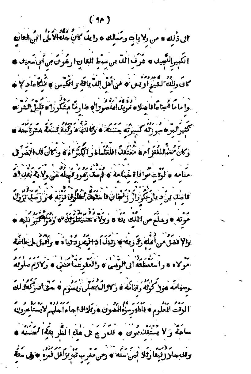 إلى ذلك من ولايات وممالك، وأيلكان جده الأعلى ابن القان الكبير النجيد شرف الدين سبط القان أرغون ابن أبي سعيد وكان والده الشيخ أويس من أهل الديانة والكيس، ملكاً عادلاً، وإماماً شجاعاً فاضلاً، مؤيداً منصوراً صارماً مشكورا، قليل الشر كثير البر، صورته كسيرته حسنة، وكانت دولته تسع عشرة سنة، وكان محباً للفقراء، معتقداً للعلماء والكبراء وكان قد أخبر في منامه بوقت موافاة حمامه، فاستعد لحلول فوته، ورصد نزول موته، وخلع من الملك يده، وولاه حسيناً ولده، وهو أكبر بنيه، والأفضل من أهله وذويه، ونبذ أدانيه ودنياه، وأقبل على طاعة مولاه، واستعطفه إلى الرضا، والعفو عما مضى، ولازم صلاته وصيامه، وزكاته وقيامه، ولا زال يصلي ويصوم، حتى أدركه ذلك الوقت المعلوم، فأظهر سره المصون، وتلا " فإذا جاء أجلهم لا يستأخرون ساعة ولا يستقدمون " فدرج على هذه الطريقة الحسنة، وقد جاوز نيفاً ثلاثين سنة، ومن مغرب تبريز أفل قمره، وفي سنة