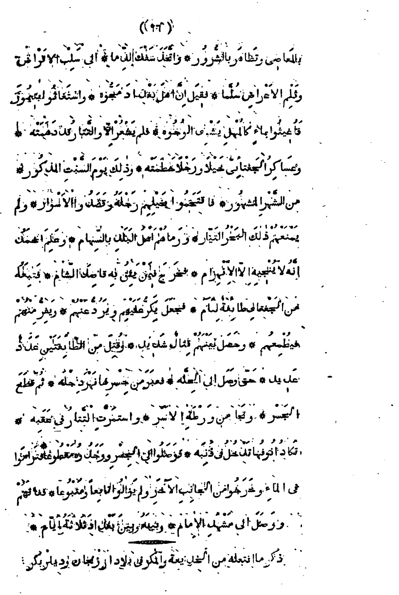 بالمعاصي وتظاهر بالشرور، واتخذ سفك الدماء إلى سلب الأموال وثلم الأعراض سلما فقبل إن أهل بغداد مجوه، واستغاثوا بتيمور، فأغيثوا بماء كالمهل يشوي الوجوه، فلم يشعر إلا والتتار قد دهمته، وعساكر الجغتاي خيلاً ورجلاً حطمته، وذلك يوم السبت المذكور، من الشهر المشهور، فاقتحموا بخيلهم دجلة وقصدوا الأسوار، ولم يمنعهم ذلك البحر البتار، ورماهم أهل البلد بالسهام وعلم أحمد أنه لا ينجيه إلا الانهزام، فخرج فيمن يثق به قاصد الشام، فتبعه من الجغتاي قوم لئام، فجعل يكر عليهم ويردعهم، ويفر منهم فيطمعهم، وحصل بينهم قتال شديد، وقتل من الطائفتين عدد عديد، حتى وصل إلى الحلة، فعبر من جسرها نهر دجلة، " ثم قطع الجسر ونجا من ورطة الأسر، واستمرت التتار في عقبه تكاد أنوفها تدخل في ذنبه فوصلوا إلى الجسر ووجدوه مقطوعاً، فتزاموا في الماء وخرجوا من الجانب الآخر ولم يزالوا تابعاً ومتبوعاً ففاتهم ووصل إلى مشهد الإمام وبينه وبين بغداد ثلاثة أيام "