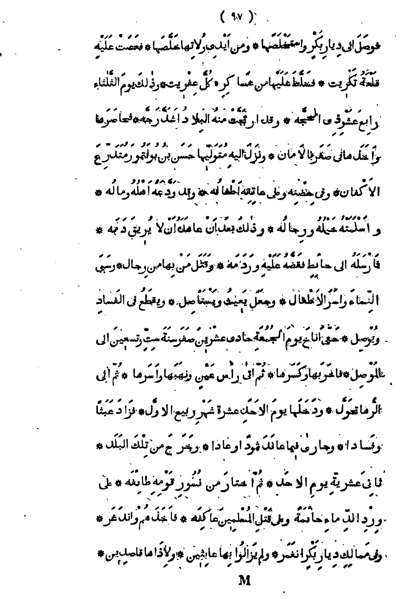 فوصل إلى ديار بكر واستخلصها، ومن أيدي ولاتها خلصها، فعصت عليه قلعة تكريت فتسلط عليها من عساكره كل عفريت، وذلك يوم الثلاثاء رابع عشر ذي الحجة، وقد ارتجت منه البلاد أشد رجة، فحاصرها وأخذها في صفر بالأمان، ونزل إليه متوليها حسن بن يولتمور متدرع الأكفان، وفي حضنه وعلى عاتقه أطفاله، وقد ودعه أهله وماله، وأسلمته خيله ورجاله، وذلك بعد أن عاهده أن لا يريق دمه، فأرسله إلى حائط فقضه عليه وردمه، وقتل من بها من رجال وسبى النساء وأسر الأطفال، وجعل يعيث ويستأصل، ويقطع في الفساد ويوصل حتى أناخ يوم الجمعة حادي عشرين صفر سنة ست وتسعين على الموصل، فأخربها وكسرها، ثم أتى رأس عين ونهبها وأسرها، ثم إلى الرها تحول، ودخلها يوم الأحد غرة شهر ربيع الأول، فزاد عيثاً وفساداً، وجارى فيما عاند ثموداً وعادا، وخرج من تلك البلد، ثاني عشرين يوم الأحد ثم اختار من نسور قومه طائفة، على ورد الدماء حائمة وعلى قتل المسلمين عاكفة، فأخذهم واندغر وفي ممالك ديار بكر انغمر، ولم يزالوا بها عائثين، ولأذاها قاصدين،
