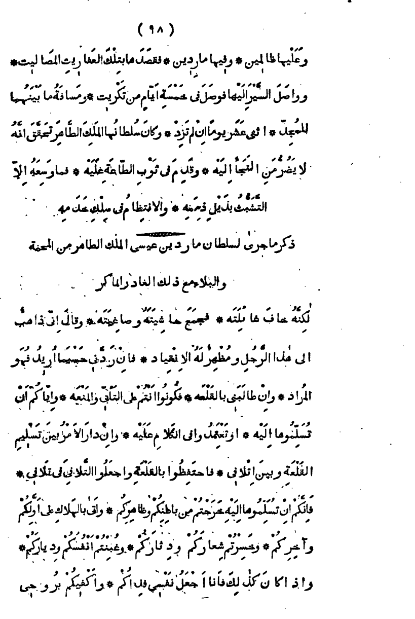 وعليها ظالمين، وفيها ماردين، فقصدها بتلك العفاريت المصاليت، وواصل السير إليها فوصلها في خمسة أيام من تكريت، ومسافة ما بينهما للمجد، اثنا عشر يوماً إن لم تزد، وكان سلطانها الملك الظاهر تحقق أنه لا يضر من التجأ إليه، وقدم في ثوب الطاعة عليه، فما وسعه إلا التشبث بذيل ذممه، والانتظام في سلك خدمه