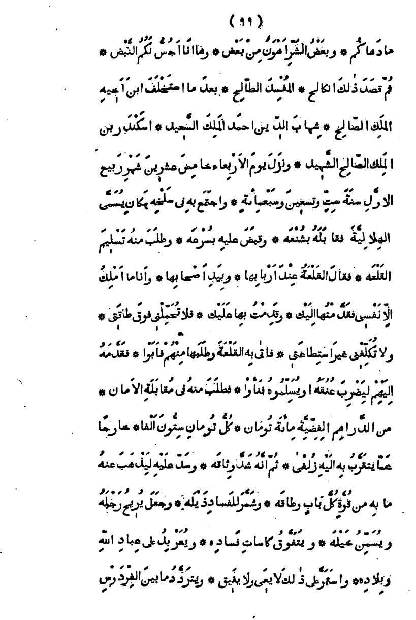 ما داهاكم، وبعض الشر أهون من بعض، وها أنا أجس لكم النبض ثم قصد ذلك الكالح والمفسد الطالح، بعدما استخلف ابن أخيه الملك الصالح شهاب الدين أحمد بن الملك السعيد اسكندر بن الملك الصالح الشهيد، ونزل يوم الأربعاء خامس عشري شهر ربيع الأول سنة تسع وتسعين وسبعمائة، واجتمع به في سلخه بمكان يسمى الهلالية، فقابله بشنعة، وقبض عليه بسرعة، وطلب منه تسليم القلعة فقال القلعة عند أربابها وبيد أصحابها وأنا لا أملك إلا نفسي فقدمتها إليك، وقدمت بها عليك، فلا تحملني فوق طاقتي، ولا تكلفني غير استطاعتي فأتى به إلى القلعة وطلبها منهم فأبوا، فقدمه إليهم ليضرب عنقه أو يسلموه فنبوا، فطلب منه في مقابلة الأمان من الدراهم الفضية مائة تومان وكل تومان ستون ألفاً، خارجاً عما يتقرب به إليه زلفى، ثم إنه شد وثاقه، وسد عليه ليذهب عنه ما به من قوة كل باب وطاقه، وشمر للفساد ذيله، وجعل يريح رجله ويسمن خيله، ويتفوق كاسات فساده، ويعربد على عباد الله وبلاده، واستمر على ذلك لا يعي ولا يفيق، ويتردد ما بين الفردوس