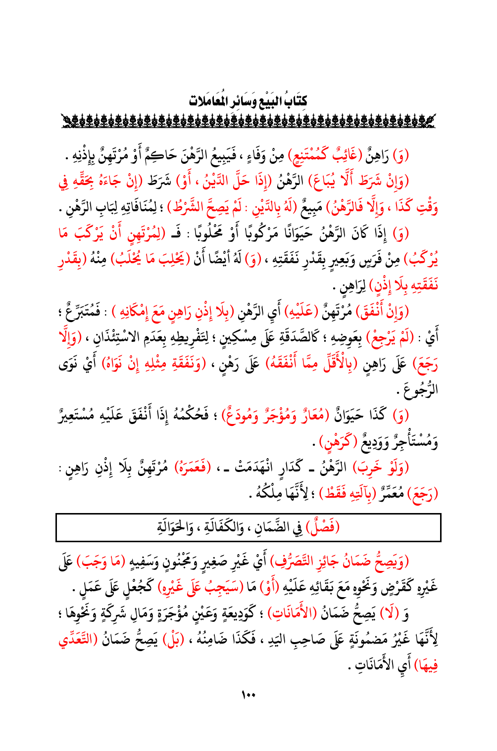 (وَإِنْ أَنْفَقَ) مُرْتَهِنٌ (عَلَيْهِ) أَيِ الرَّهْنِ (بِلَا إِذْنِ رَاهِنٍ مَعَ إِمْكَانِهِ): فَمُتَبَرِّعٌ؛ أَيْ: (لَمْ يَرْجِعْ) بِعَوِضِهِ؛ كَالصَّدَقَةِ عَلَى مِسْكِينٍ؛ لِتَفْرِيطِهِ بِعَدَمِ الاسْتِئْذَانِ، (وَإِلَّا رَجَعَ) عَلَى رَاهِنٍ (بِالْأَقَلِّ مِمَّا أَنْفَقَهُ) عَلَى رَهْنٍ، (وَنَفَقَةِ مِثْلِهِ إِنْ نَوَاهُ) أَيْ نَوَى الرُّجُوعَ.