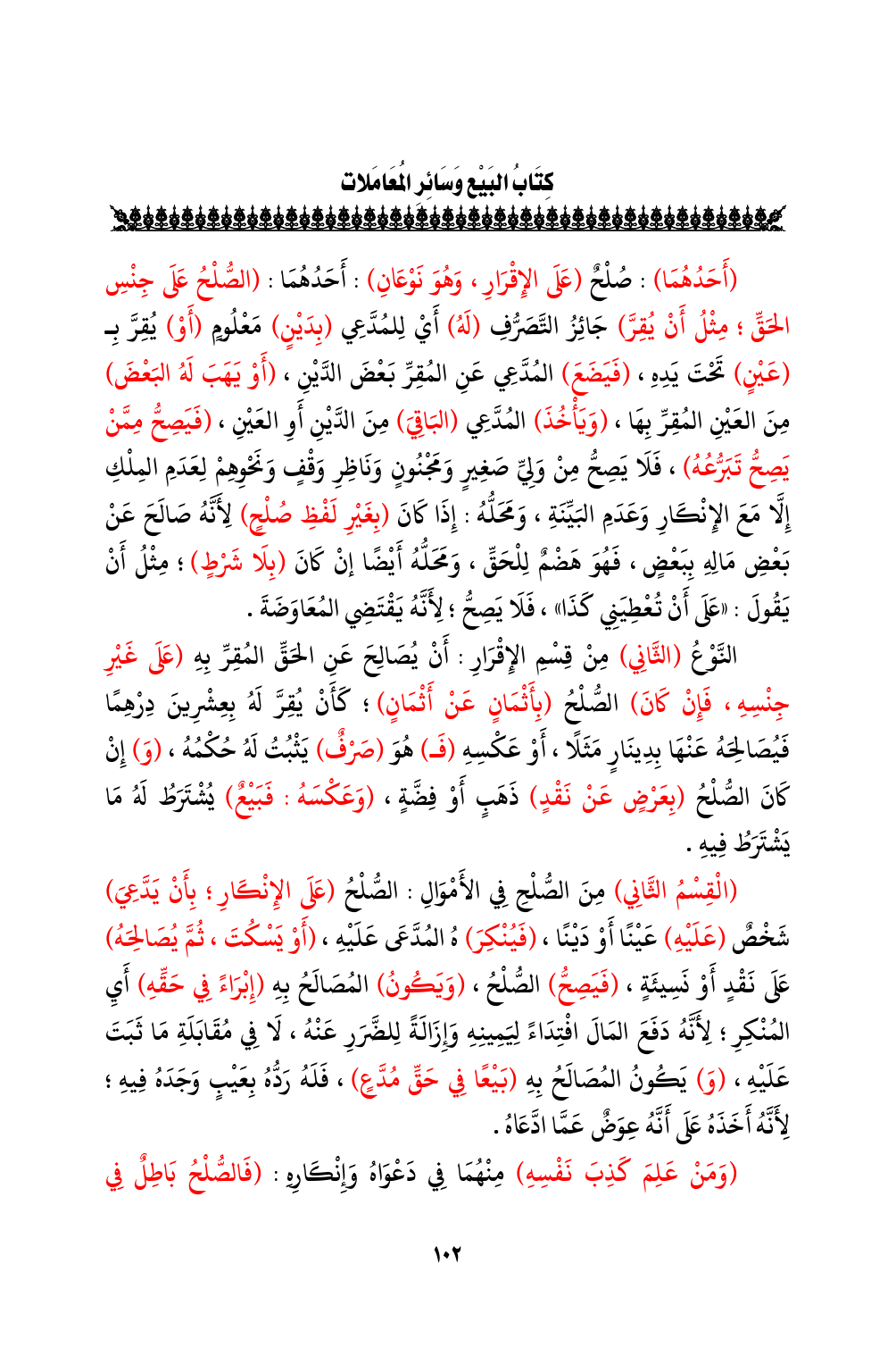 (الْقِسْمُ الثَّانِي) مِنَ الصُّلْحِ فِي الأَمْوَالِ: الصُّلْحُ (عَلَى الإِنْكَارِ؛ بِأَنْ يَدَّعِيَ) شَخْصٌ (عَلَيْهِ) عَيْنًا أَوْ دَيْنًا، (فَيُنْكِرَ) هُ المُدَّعَى عَلَيْهِ، (أَوْ يَسْكُتَ، ثُمَّ يُصَالِحَهُ) عَلَى نَقْدٍ أَوْ نَسِيئَةٍ، (فَيَصِحُّ) الصُّلْحُ، (وَيَكُونُ) المُصَالَحُ بِهِ (إِبْرَاءً فِي حَقِّهِ) أَيِ المُنْكِرِ؛ لِأَنَّهُ دَفَعَ المَالَ افْتِدَاءً لِيَمِينِهِ وَإِزَالَةً لِلضَّرَرِ عَنْهُ، لَا فِي مُقَابَلَةِ مَا ثَبَتَ عَلَيْهِ، (وَ) يَكُونُ المُصَالَحُ بِهِ (بَيْعًا فِي حَقِّ مُدَّعٍ)، فَلَهُ رَدُّهُ بِعَيْبٍ وَجَدَهُ فِيهِ؛ لِأَنَّهُ أَخَذَهُ عَلَى أَنَّهُ عِوَضٌ عَمَّا ادَّعَاهُ.
