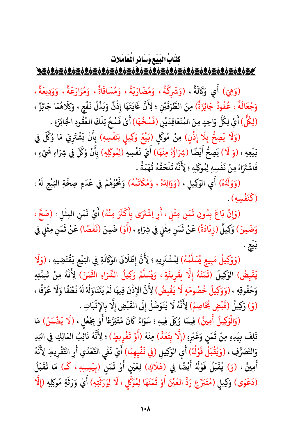 (وَلَا يَصِحُّ بِلَا إِذْنٍ) مِنْ مُوكَلٍ (بَيْعُ وَكِيلٍ لِنَفْسِهِ) بِأَنْ يَشْتَرِيَ مَا وُكِّلَ فِي بَيْعِهِ، (وَلَا) يَصِحُّ أَيْضًا (شِرَاؤُهُ مِنْهَا) أَيْ نَفْسِهِ (لِمُوكَلِهِ) بِأَنْ وُكِّلَ فِي شِرَاءِ شَيْءٍ، فَاشْتَرَاهُ مِنْ نَفْسِهِ لِمُوكَلِهِ؛ لِأَنَّهُ تَلْحَقُهُ تُهَمَةٌ.