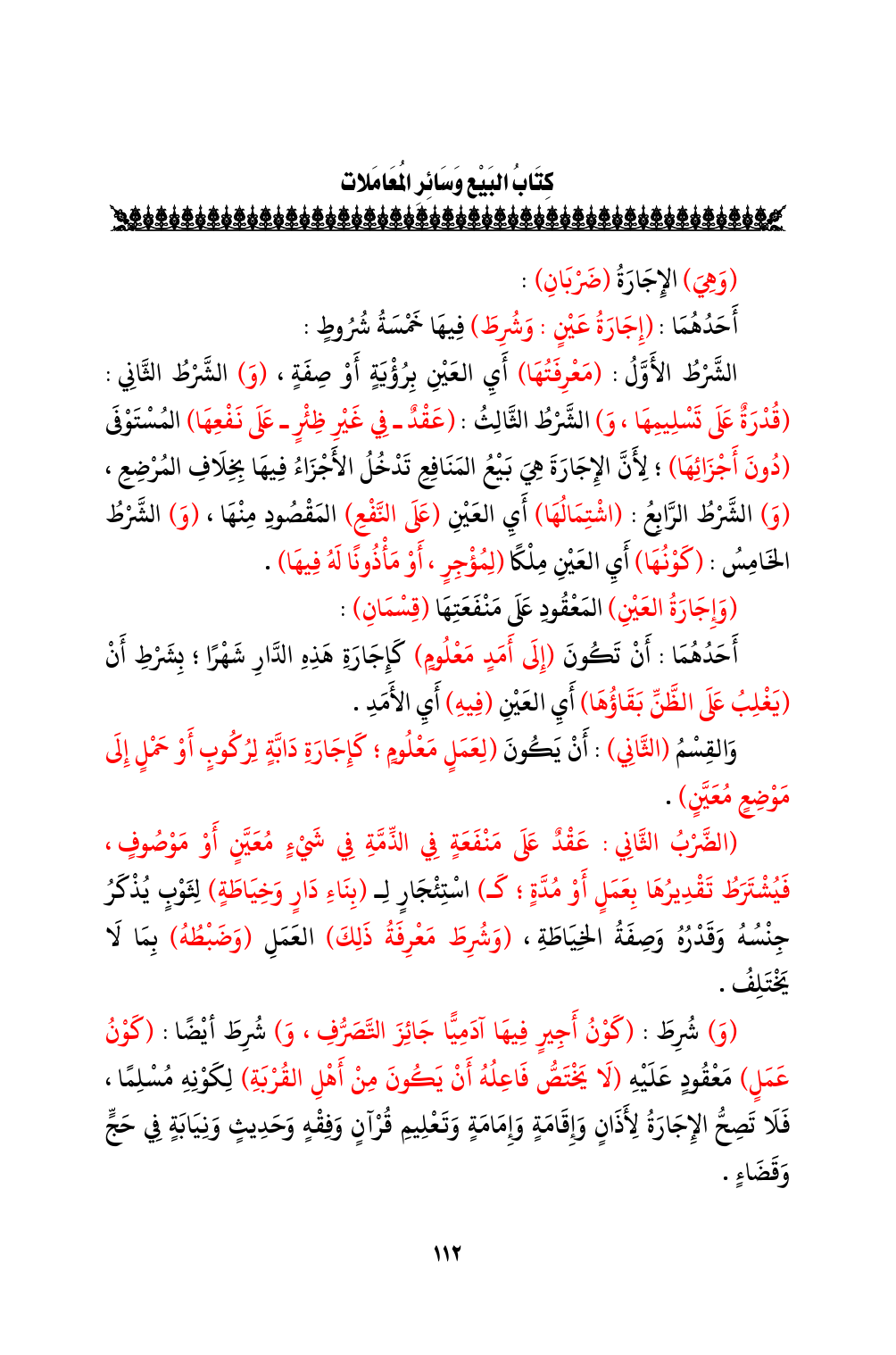 أَحَدُهُمَا: (إِجَارَةُ عَيْنٍ: وَشُرِطَ) فِيهَا خَمْسَةُ شُرُوطٍ:
