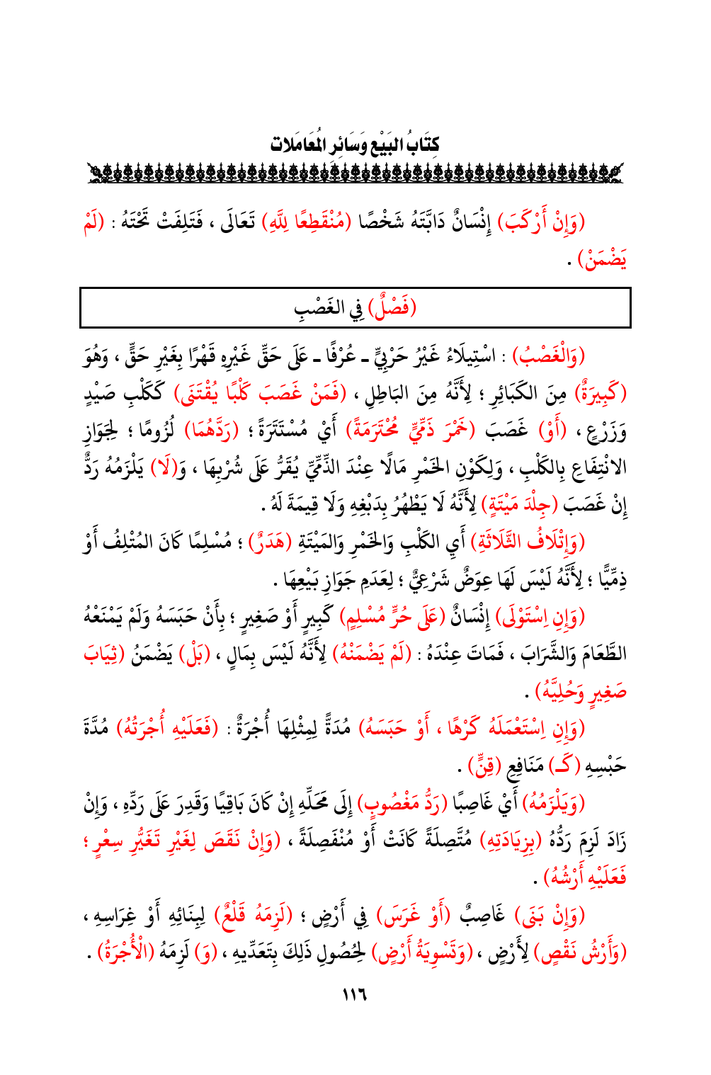 (وَالْغَصْبُ): اسْتِيلَاءُ غَيْرُ حَرْبِيٍّ - عُرْفًا - عَلَى حَقِّ غَيْرِهِ قَهْرًا بِغَيْرِ حَقٍّ، وَهُوَ (كَبِيرَةٌ) مِنَ الكَبَائِرِ؛ لِأَنَّهُ مِنَ البَاطِلِ، (فَمَنْ غَصَبَ كَلْبًا يُقْتَنَى) كَكَلْبِ صَيْدٍ وَزَرْعٍ، (أَوْ) غَصَبَ (خَمْرَ ذَمِّيٍّ مُحْتَرَمَةً) أَيْ مُسْتَتَرَةً؛ (رَدَّهُمَا) لُزُومًا؛ لِجَوَازِ الانْتِفَاعِ بِالكَلْبِ، وَلِكَوْنِ الخَمْرِ مَالًا عِنْدَ الذِّمِّيِّ يُقَرُّ عَلَى شُرْبِهَا، وَ (لَا) يَلْزَمُهُ رَدٌّ إِنْ غَصَبَ (جِلْدَ مَيْتَةٍ) لِأَنَّهُ لَا يَطْهُرُ بِدَبْغِهِ وَلَا قِيمَةَ لَهُ.