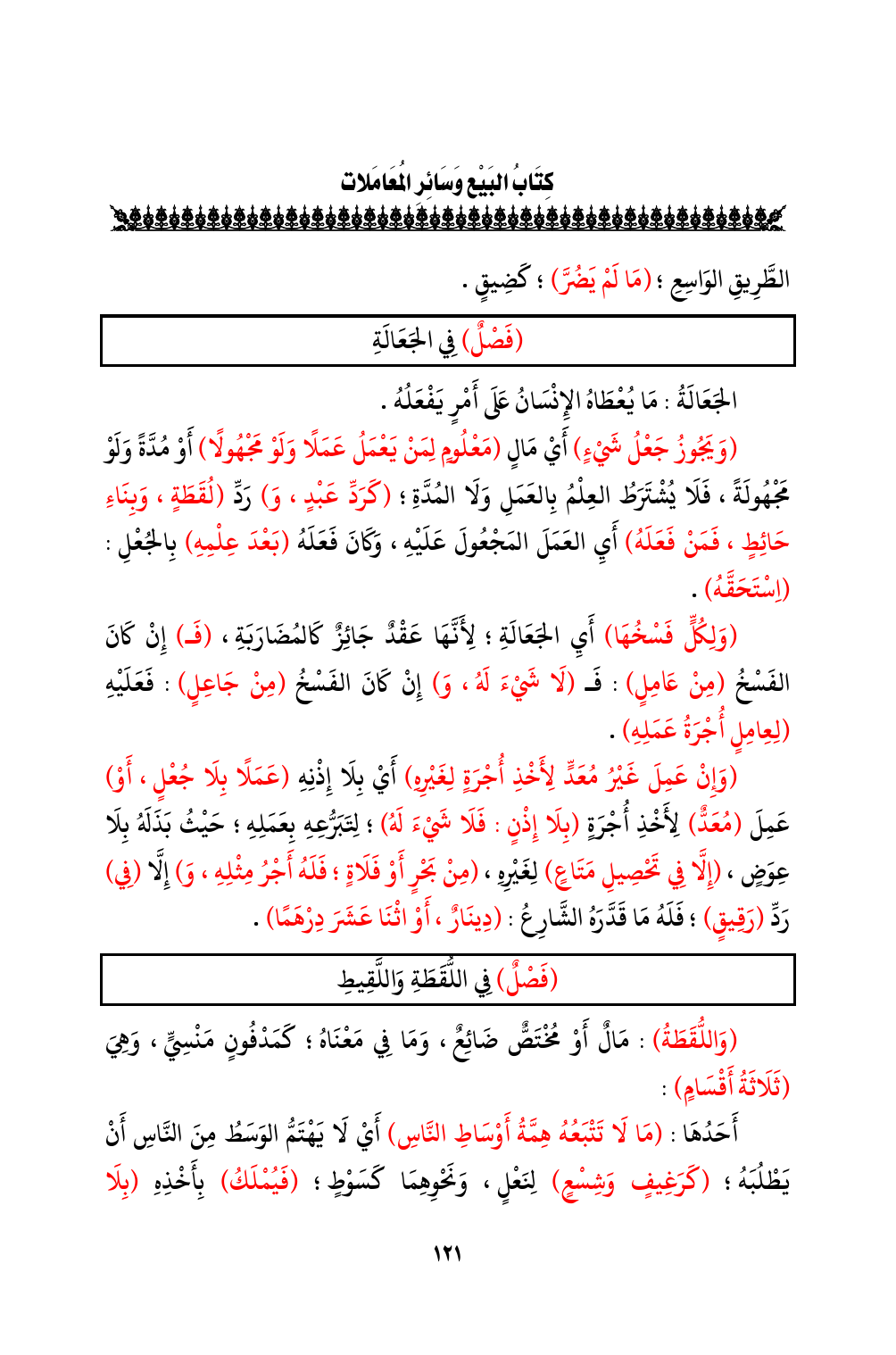 (وَيَجُوزُ جَعْلُ شَيْءٍ) أَيْ مَالٍ (مَعْلُومٍ لِمَنْ يَعْمَلُ عَمَلًا وَلَوْ مَجْهُولًا) أَوْ مُدَّةً وَلَوْ مَجْهُولَةً، فَلَا يُشْتَرَطُ العِلْمُ بِالعَمَلِ وَلَا المُدَّةِ؛ (كَرَدِّ عَبْدٍ، وَ) رَدِّ (لُقَطَةٍ، وَبِنَاءِ حَائِطٍ، فَمَنْ فَعَلَهُ) أَيِ العَمَلَ المَجْعُولَ عَلَيْهِ، وَكَانَ فَعَلَهُ (بَعْدَ عِلْمِهِ) بِالجُعْلِ: (اِسْتَحَقَّهُ).