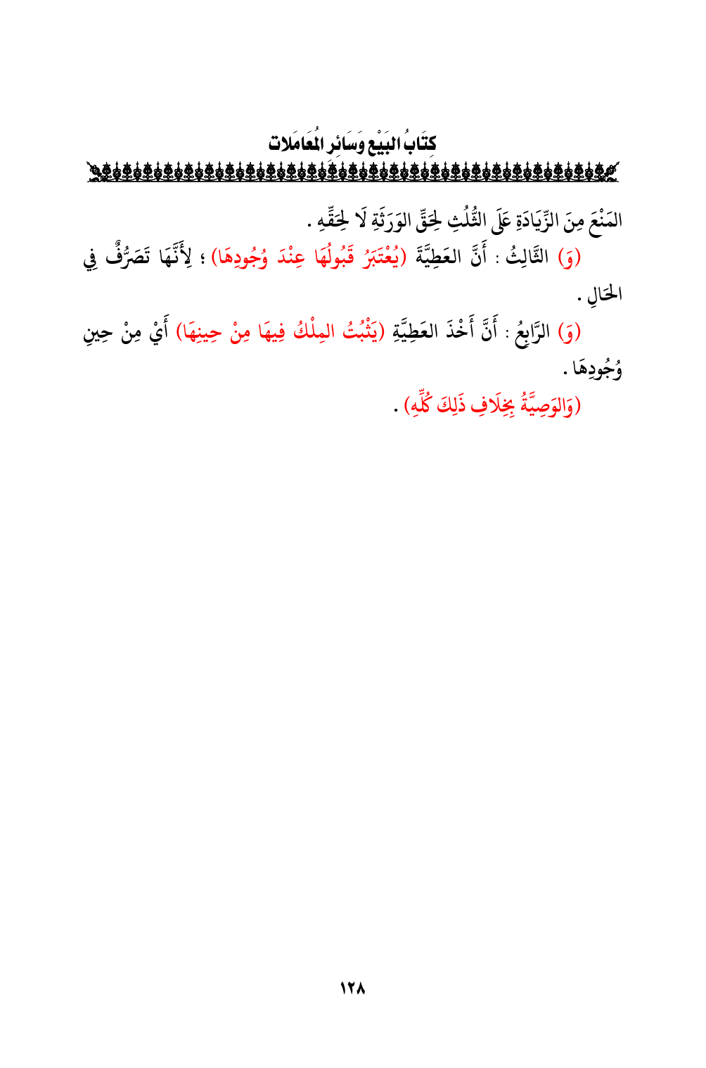 (وَ) الثَّالِثُ: أَنَّ العَطِيَّةَ (يُعْتَبَرُ قَبُولُهَا عِنْدَ وُجُودِهَا)؛ لِأَنَّهَا تَصَرُّفٌ فِي الحَالِ.