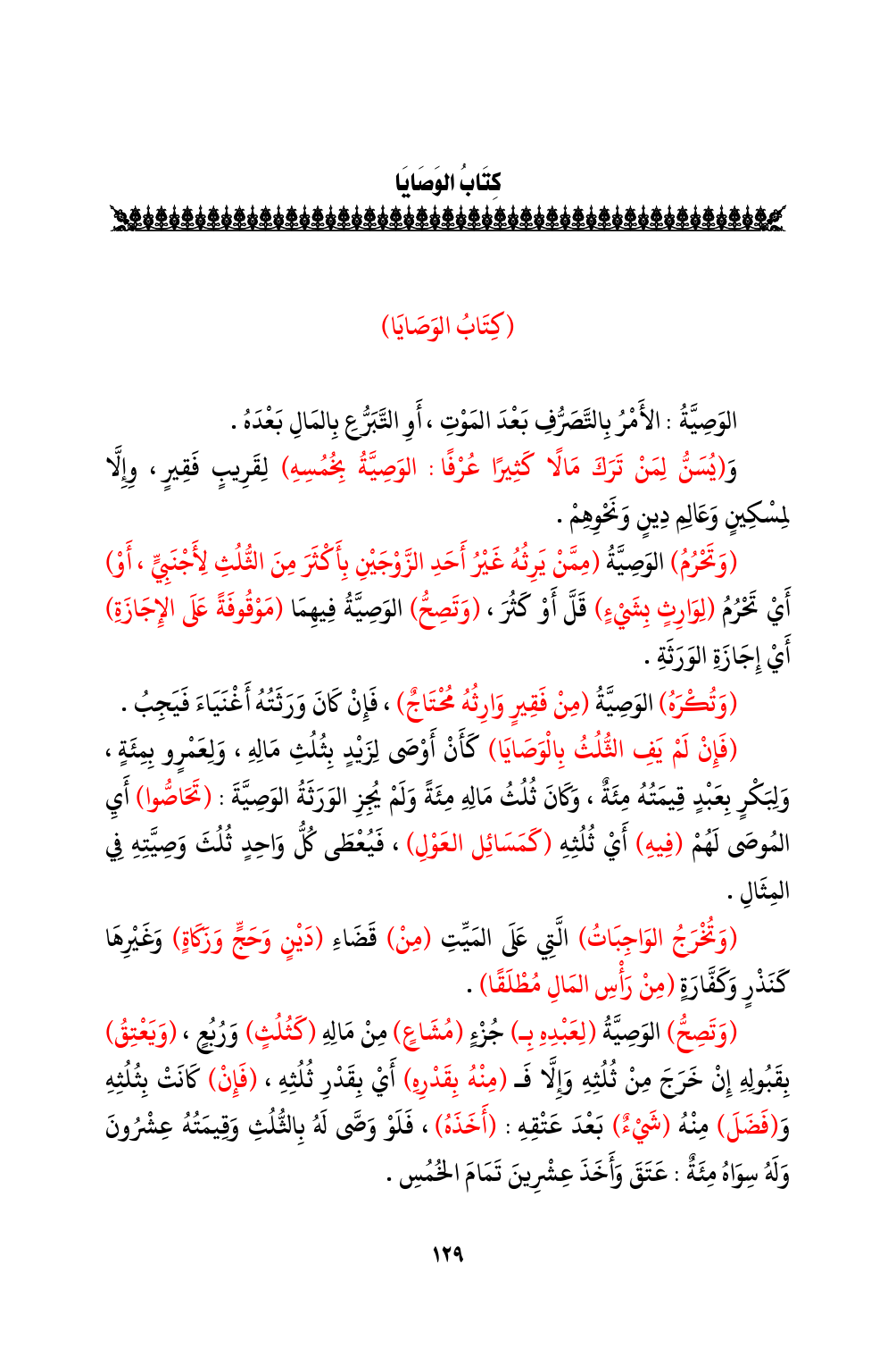 (فَإِنْ لَمْ يَفِ الثُّلُثُ بِالْوَصَايَا) كَأَنْ أَوْصَى لِزَيْدٍ بِثُلُثِ مَالِهِ، وَلِعَمْرٍو بِمِئَةٍ، وَلِبَكْرٍ بِعَبْدٍ قِيمَتُهُ مِئَةٌ، وَكَانَ ثُلُثُ مَالِهِ مِئَةً وَلَمْ يُجِزِ الوَرَثَةُ الوَصِيَّةَ: (تَحَاصُّوا) أَيِ المُوصَى لَهُمْ (فِيهِ) أَيْ ثُلُثِهِ (كَمَسَائِل العَوْلِ)، فَيُعْطَى كُلُّ وَاحِدٍ ثُلُثَ وَصِيَّتِهِ فِي المِثَالِ.