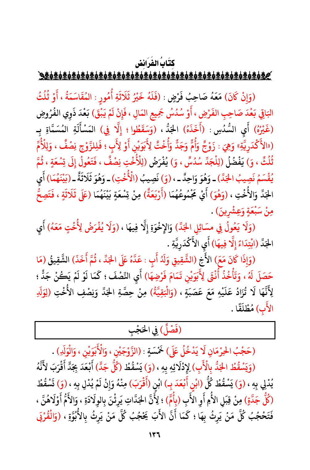 (وَإِنْ كَانَ) مَعَهُ صَاحِبُ فَرْضٍ: (فَلَهُ خَيْرُ ثَلَاثَةِ أُمُورٍ: المُقَاسَمَةُ، أَوْ ثُلُثُ البَاقِي بَعْدَ صَاحِبِ الفَرْضِ، أَوْ سُدُسُ جَمِيعِ المَالِ، فَإِنْ لَمْ يَبْقَ) بَعْدَ ذَوِي الفُرُوضِ (غَيْرُهُ) أَيِ السُّدُسِ: (أَخَذَهُ) الجَدُّ، (وَسَقَطُوا؛ إِلَّا فِي) المَسْأَلَةِ المُسَمَّاةِ بِـ («الأَكْدَرِيَّةِ» وَهِيَ: زَوْجٌ وَأُمٌّ وَجَدٌّ وَأُخْتٌ لِأَبَوَيْنِ أَوْ لِأَبٍ؛ فَلِلزَّوْجِ نِصْفٌ، وَلِلْأُمِّ ثُلُثٌ، وَ) يَفْضُلُ (لِلْجَدِّ سُدُسٌ، وَ) يُفْرَضُ (لِلْأُخْتِ نِصْفٌ، فَتَعُولُ إِلَى تِسْعَةٍ، ثُمَّ يُقْسَمُ نَصِيبُ الجَدِّ) - وَهُوَ وَاحِدٌ -، (وَ) نَصِيبُ (الْأُخْتِ) - وَهُوَ ثَلَاثَةٌ - (بَيْنَهُمَا) أَيِ الجَدِّ وَالأُخْتِ، (وَهُوَ) أَيْ مَجْمُوعُهُمَا (أَرْبَعَةٌ) مِنْ تِسْعَةٍ بَيْنَهُمَا (عَلَى ثَلَاثَةٍ، فَتَصِحُّ مِنْ سَبْعَةٍ وَعِشْرِينَ).