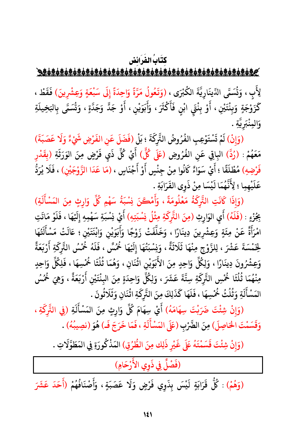 (وَإِنْ) لَمْ تَسْتَوْعِبِ الفُرُوضُ التَّرِكَةَ؛ بَلْ (فَضَلَ عَنِ الفَرْضِ شَيْءٌ وَلَا عَصَبَةَ) مَعَهُمْ: (رُدَّ) البِاقِي عَنِ الفُرُوضِ (عَلَى كُلٍّ) أَيْ كُلِّ ذَيِ فَرْضٍ مِنَ الوَرَثَةِ (بِقَدْرِ فَرْضِهِ) مُطْلَقًا؛ أَيْ سَوَاءٌ كَانُوا مِنْ جِنْسٍ أَوْ أَجْنَاسٍ، (مَا عَدَا الزَّوْجَيْنِ)، فَلَا يُرَدُّ عَلَيْهِمِا؛ لِأَنَّهُمَا لَيْسَا مِنْ ذَوِى القَرَابَةِ.