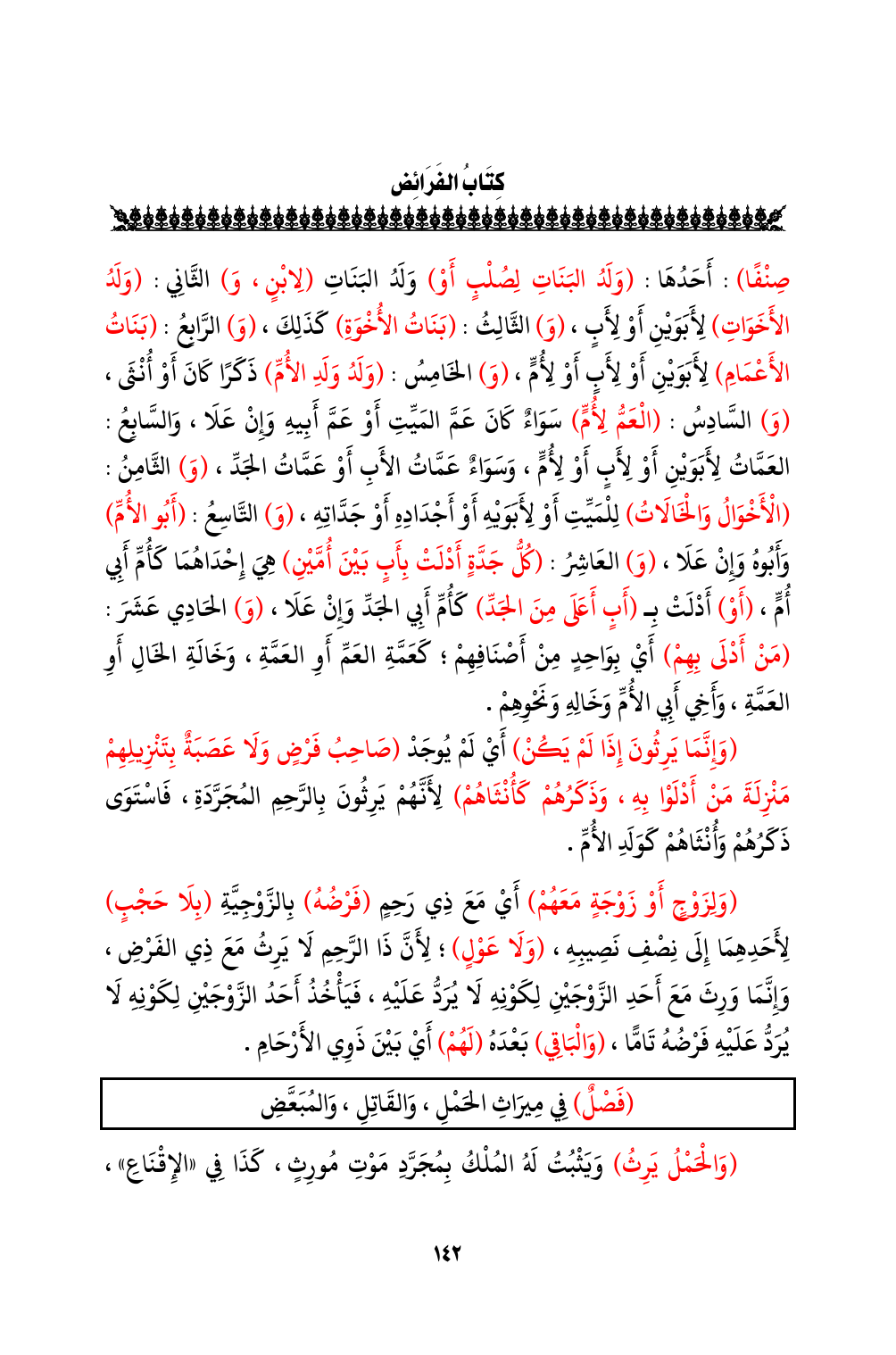 صِنْفًا): أَحَدُهَا: (وَلَدُ البَنَاتِ لِصُلْبٍ أَوْ) وَلَدُ البَنَاتِ (لِابْنٍ، وَ) الثَّانِي: (وَلَدُ الأَخَوَاتِ) لِأَبَوَيْنِ أَوْ لِأَبٍ، (وَ) الثَّالِثُ: (بَنَاتُ الأُخْوَةِ) كَذَلِكَ، (وَ) الرَّابِعُ: (بَنَاتُ الأَعْمَامِ) لِأَبَوَيْنِ أَوْ لِأَبٍ أَوْ لِأُمٍّ، (وَ) الخَامِسُ: (وَلَدُ وَلَدِ الأُمِّ) ذَكَرًا كَانَ أَوْ أُنْثَى، (وَ) السَّادِسُ: (الْعَمُّ لِأُمٍّ) سَوَاءٌ كَانَ عَمَّ المَيِّتِ أَوْ عَمَّ أَبِيهِ وَإِنْ عَلَا، وَالسَّابِعُ: العَمَّاتُ لِأَبَوَيْنِ أَوْ لِأَبٍ أَوْ لِأُمٍّ، وَسَوَاءٌ عَمَّاتُ الأَبِ أَوْ عَمَّاتُ الجَدِّ، (وَ) الثَّامِنُ: (الْأَخْوَالُ وَالْخَالَاتُ) لِلْمَيِّتِ أَوْ لِأَبَوَيْهِ أَوْ أَجْدَادِهِ أَوْ جَدَّاتِهِ، (وَ) التَّاسِعُ: (أَبُو الأُمِّ) وَأَبُوهُ وَإِنْ عَلَا، (وَ) العَاشِرُ: (كُلُّ جَدَّةٍ أَدْلَتْ بِأَبٍ بَيْنَ أُمَّيْنِ) هِيَ إِحْدَاهُمَا كَأُمِّ أَبِي أُمٍّ، (أَوْ) أَدْلَتْ بِـ (أَبٍ أَعَلَى مِنَ الجَدِّ) كَأُمِّ أَبِي الجَدِّ وَإِنْ عَلَا، (وَ) الحَادِي عَشَرَ: (مَنْ أَدْلَى بِهِمْ) أَيْ بِوَاحِدٍ مِنْ أَصْنَافِهِمْ؛ كَعَمَّةِ العَمِّ أَوِ العَمَّةِ، وَخَالَةِ الخَالِ أَوِ العَمَّةِ، وَأَخِي أَبِي الأُمِّ وَخَالِهِ وَنَحْوِهِمْ.