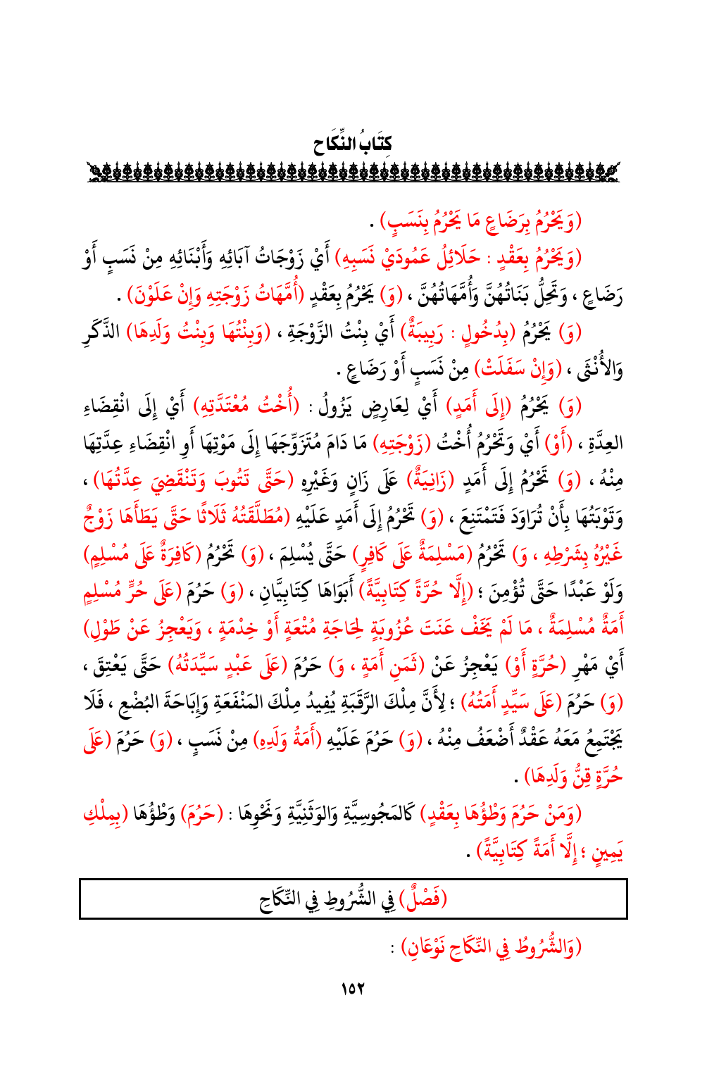 (وَ) يَحْرُمُ (إِلَى أَمَدٍ) أَيْ لِعَارِضٍ يَزُولُ: (أُخْتُ مُعْتَدَّتِهِ) أَيْ إِلَى انْقِضَاءِ العِدَّةِ، (أَوْ) أَيْ وَتَحْرُمُ أُخْتُ (زَوْجَتِهِ) مَا دَامَ مُتَزَوِّجَهَا إِلَى مَوْتِهَا أَوِ انْقِضَاءِ عِدَّتِهَا مِنْهُ، (وَ) تَحْرُمُ إِلَى أَمَدٍ (زَانِيَةٌ) عَلَى زَانٍ وَغَيْرِهِ (حَتَّى تَتُوبَ وَتَنْقَضِيَ عِدَّتُهَا)، وَتَوْبَتُهَا بِأَنْ تُرَاوَدَ فَتَمْتَنِعَ، (وَ) تَحْرُمُ إِلَى أَمَدٍ عَلَيْهِ (مُطَلَّقَتُهُ ثَلَاثًا حَتَّى يَطَأَهَا زَوْجٌ غَيْرُهُ بِشَرْطِهِ، وَ) تَحْرُمُ (مَسْلِمَةٌ عَلَى كَافِرٍ) حَتَّى يُسْلِمَ، (وَ) تَحْرُمُ (كَافِرَةٌ عَلَى مُسْلِمٍ) وَلَوْ عَبْدًا حَتَّى تُؤْمِنَ؛ (إِلَّا حُرَّةً كِتَابِيَّةً) أَبَوَاهَا كِتَابِيَّانِ، (وَ) حَرُمَ (عَلَى حُرٍّ مُسْلِمٍ أَمَةٌ مُسْلِمَةٌ، مَا لَمْ يَخَفْ عَنَتَ عُزُوبَةٍ لِحَاجَةِ مُتْعَةٍ أَوْ خِدْمَةٍ، وَيَعْجِزُ عَنْ طَوْلِ) أَيْ مَهْرِ (حُرَّةٍ أَوْ) يَعْجِزُ عَنْ (ثَمَنِ أَمَةٍ، وَ) حَرُمَ (عَلَى عَبْدٍ سَيِّدَتُهُ) حَتَّى يَعْتِقَ، (وَ) حَرُمَ (عَلَى سَيِّدٍ أَمَتُهُ)؛ لِأَنَّ مِلْكَ الرَّقَبَةِ يُفِيدُ مِلْكَ المَنْفَعَةِ وَإِبَاحَةَ البُضْعِ، فَلَا يَجْتَمِعُ مَعَهُ عَقْدٌ أَضْعَفُ مِنْهُ، (وَ) حَرُمَ عَلَيْهِ (أَمَةُ وَلَدِهِ) مِنْ نَسَبٍ، (وَ) حَرُمَ (عَلَى حُرَّةٍ قِنُّ وَلَدِهَا).