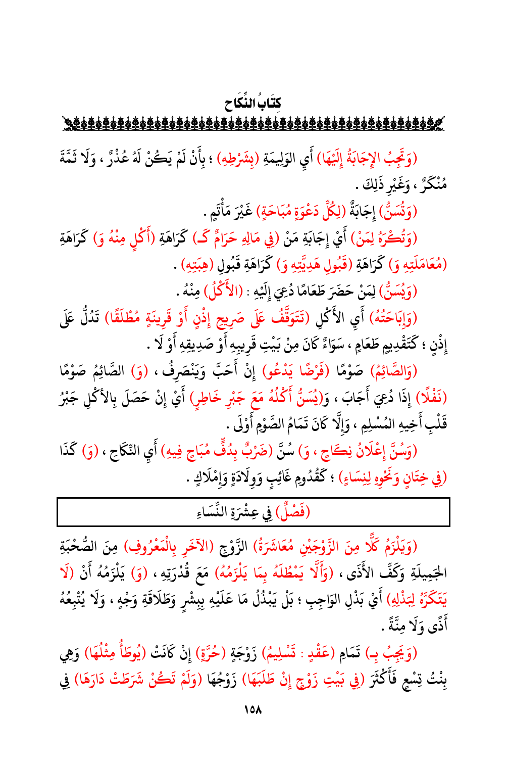 (وَتَجِبُ الإِجَابَةُ إِلَيْهَا) أَيِ الوَلِيمَةِ (بِشَرْطِهِ)؛ بِأَنْ لَمْ يَكُنْ لَهُ عُذْرٌ، وَلَا ثَمَّةَ مُنْكَرٌ، وَغَيْرِ ذَلِكَ.