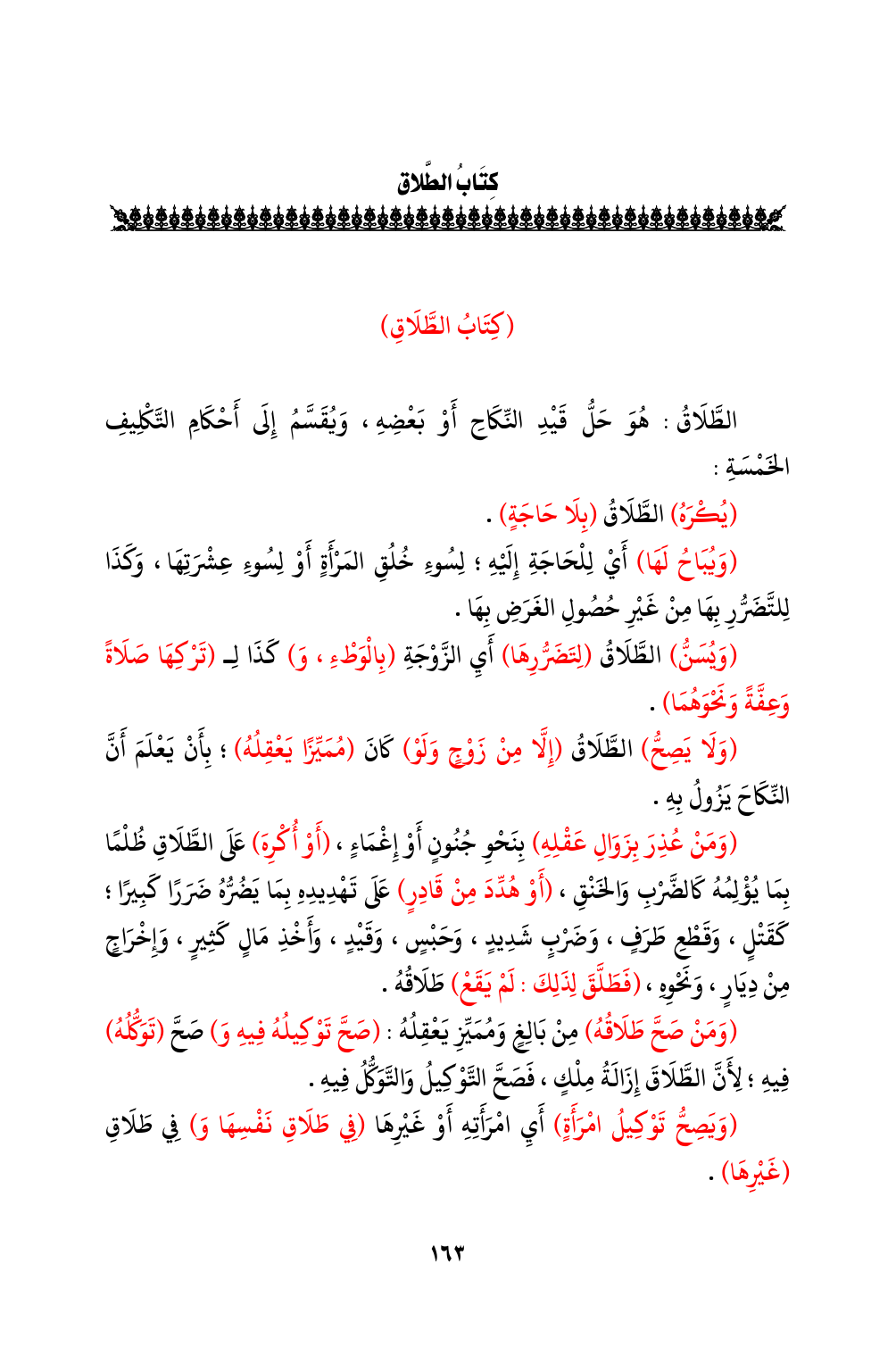 الطَّلَاقُ: هُوَ حَلُّ قَيْدِ النِّكَاحِ أَوْ بَعْضِهِ، وَيُقَسَّمُ إِلَى أَحْكَامِ التَّكْلِيفِ الخَمْسَةِ: