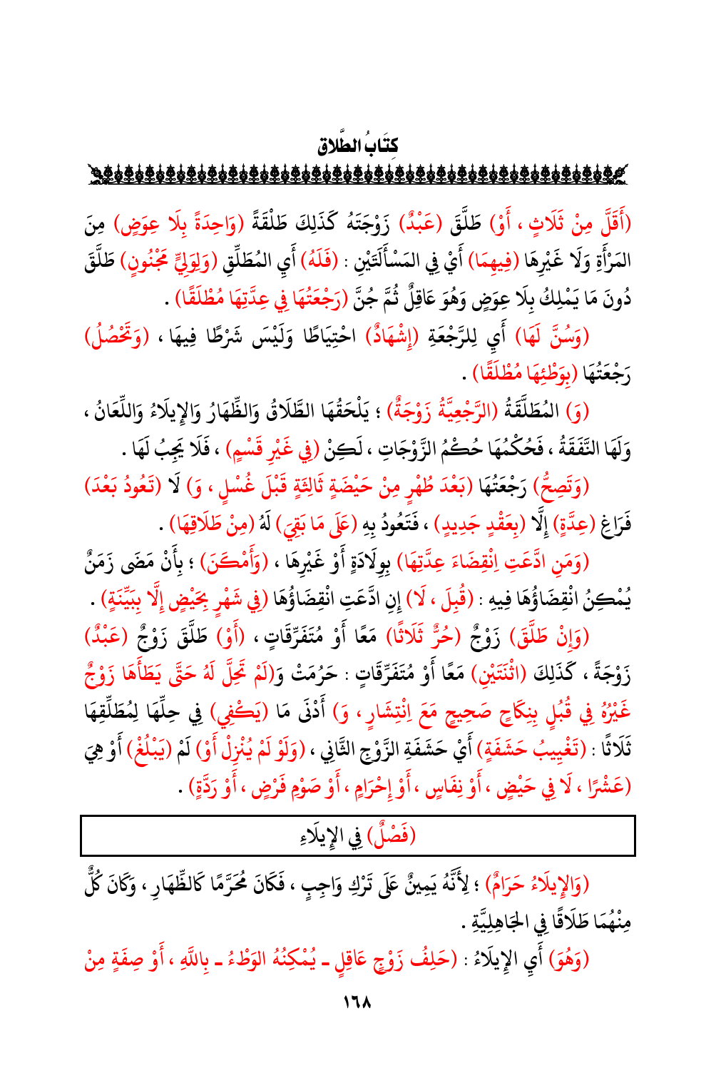 (وَ) المُطَلَّقَةُ (الرَّجْعِيَّةُ زَوْجَةٌ)؛ يَلْحَقُهَا الطَّلَاقُ وَالظِّهَارُ وَالإِيلَاءُ وَاللِّعَانُ، وَلَهَا النَّفَقَةُ، فَحُكْمُهَا حُكْمُ الزَّوْجَاتِ، لَكِنْ (فِي غَيْرِ قَسْمٍ)، فَلَا يَجِبُ لَهَا.