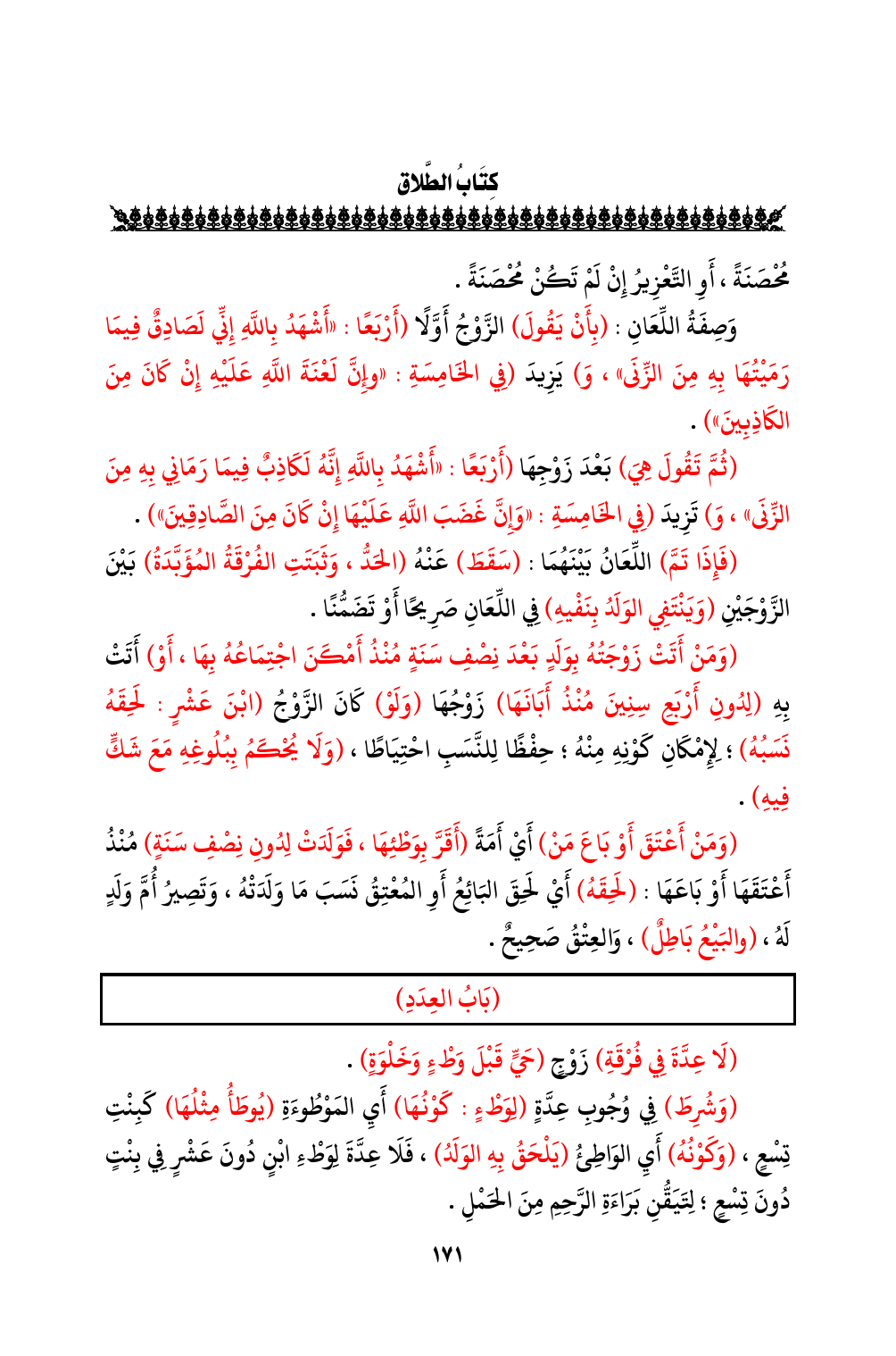 (ثُمَّ تَقُولَ هِيَ) بَعْدَ زَوْجِهَا (أَرْبَعًا: «أَشْهَدُ بِاللَّهِ إِنَّهُ لَكَاذِبٌ فِيمَا رَمَانِي بِهِ مِنَ الزِّنَى»، وَ) تَزِيدَ (فِي الخَامِسَةِ: «وَإِنَّ غَضَبَ اللَّهِ عَلَيْهَا إِنْ كَانَ مِنَ الصَّادِقِينَ»).
