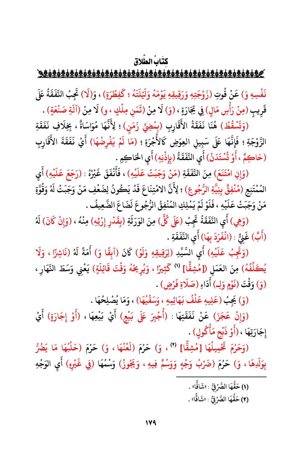 نَفْسِهِ وَ) عَنْ قُوتِ (زَوْجَتِهِ وَرَقِيقِهِ يَوْمَهُ وَلَيْلَتَهُ؛ كَفِطْرَةٍ)، وَ (لَا) تَجِبُ النَّفَقَةُ عَلَى قَرِيبٍ (مِنْ رَأْسِ مَالٍ) فِي تِجَارَةٍ، (وَ) لَا مِنْ (ثَمَنِ مِلْكٍ، و) لَا مِنْ (آلَةِ صَنْعَةٍ).