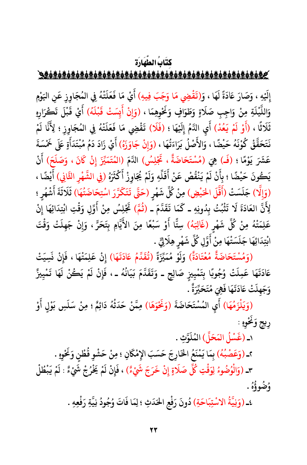 إِلَيْهِ، وَصَارَ عَادَةً لَهَا، وَ (تَقْضِي مَا وَجَبَ فِيهِ) أَيْ مَا فَعَلَتْهُ فِي المُجَاوِزِ عَنِ اليَوْمِ وَاللَّيْلَةِ مِنْ وَاجِبِ صَلَاةٍ وَطَوَافٍ وَنَحْوِهِمَا، (وَإِنْ أَيِسَتْ قَبْلَهُ) أَيْ قَبْلَ تَكْرَارِهِ ثَلَاثًا، (أَوْ لَمْ يَعُدْ) أَيِ الدَّمُ إِلَيْهَا؛ (فَلَا) تَقْضِي مَا فَعَلَتْهُ فِي المُجَاوِزِ؛ لِأَنَّا لَمْ نَتَحَقَّقْ كُوْنَهُ حَيْضًا، وَالأَصْلُ بَرَاءَتُهَا، (وَإِنْ جَاوَزَهُ) أَيْ زَادَ دَمُ مُبْتَدَأَةٍ عَلَى خَمْسَةَ عَشَرَ يَوْمًا؛ (فَـ) هِيَ (مُسْتَحَاضَةٌ، تَجْلِسُ) الدَّمَ (المُتَمَيِّزَ إِنْ كَانَ، وَصَلَحَ) أَنْ يَكُونَ حَيْضًا؛ بِأَنْ لَمْ يَنْقُصْ عَنْ أَقَلِّهِ وَلَمْ يُجَاوِزْ أَكْثَرَهُ (فِي الشَّهْرِ الثَّانِي) أَيْضًا، (وَإِلَّا) جَلَسَتْ (أَقَّلَ الحَيْضِ) مِنْ كُلِّ شَهْرٍ (حَتَّى تَتَكَرَّرَ اسْتِحَاضَتُهَا) ثَلَاثَةَ أَشْهُرٍ؛ لِأَنَّ العَادَةَ لَا تَثْبُتُ بِدُونِهِ - كَمَا تَقَدَّمَ - (ثُمَّ) تَجْلِسُ مِنْ أَوِّلِ وَقْتِ ابْتِدَائِهَا إِنْ عَلِمَتْهُ مِنْ كُلِّ شَهْرٍ (غَالِبَهُ) سِتًّا أَوْ سَبْعًا مِنَ الأَيَّامِ بِتَحَرٍّ، وَإِنْ جَهِلَتْ وَقْتَ ابْتِدَائِهَا جَلَسَتْهَا مِنْ أَوَّلِ كُلِّ شَهْرٍ هِلَالِيٍّ.
