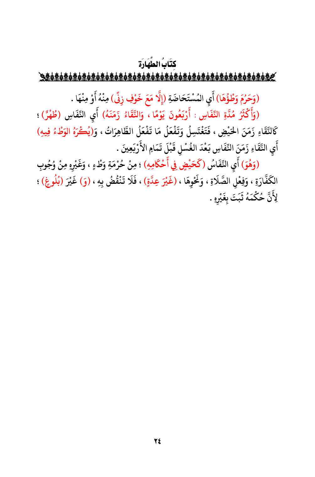 (وَأَكْثَرُ مُدَّةِ النِّفَاسِ: أَرْبَعُونَ يَوْمًا، وَالنَّقَاءُ زَمَنَهُ) أَيِ النِّفَاسِ (طُهْرٌ)؛ كَالنَّقَاءِ زَمَنَ الحَيْضِ، فَتَغْتَسِلُ وَتَفْعَلُ مَا تَفْعَلُ الطَّاهِرَاتُ، وَ (يُكْرَهُ الوَطْءُ فِيهِ) أَيِ النَّقَاءِ زَمَنَ النِّفَاسِ بَعْدَ الغُسْلِ قَبْلَ تَمَامِ الأَرْبَعِينَ.