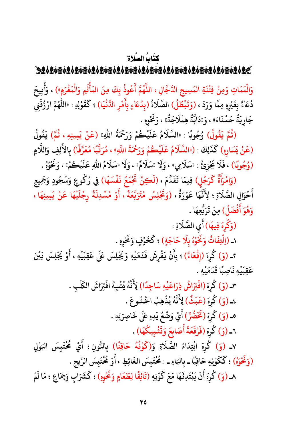 7 - (وَ) كُرِهَ ابْتِدَاءُ الصَّلَاةِ وَ (كَوْنُهُ حَاقِنًا) بِالنُّونِ؛ أَيْ مُحْتَبِسَ البَوْلِ (وَنَحْوَهُ)؛ كَكَوْنِهِ حَاقِبًا - بِالبَاءِ -: مُحْتَبِسَ الغَائِطِ، أَوْ مُحْتَبِسَ الرِّيحِ.