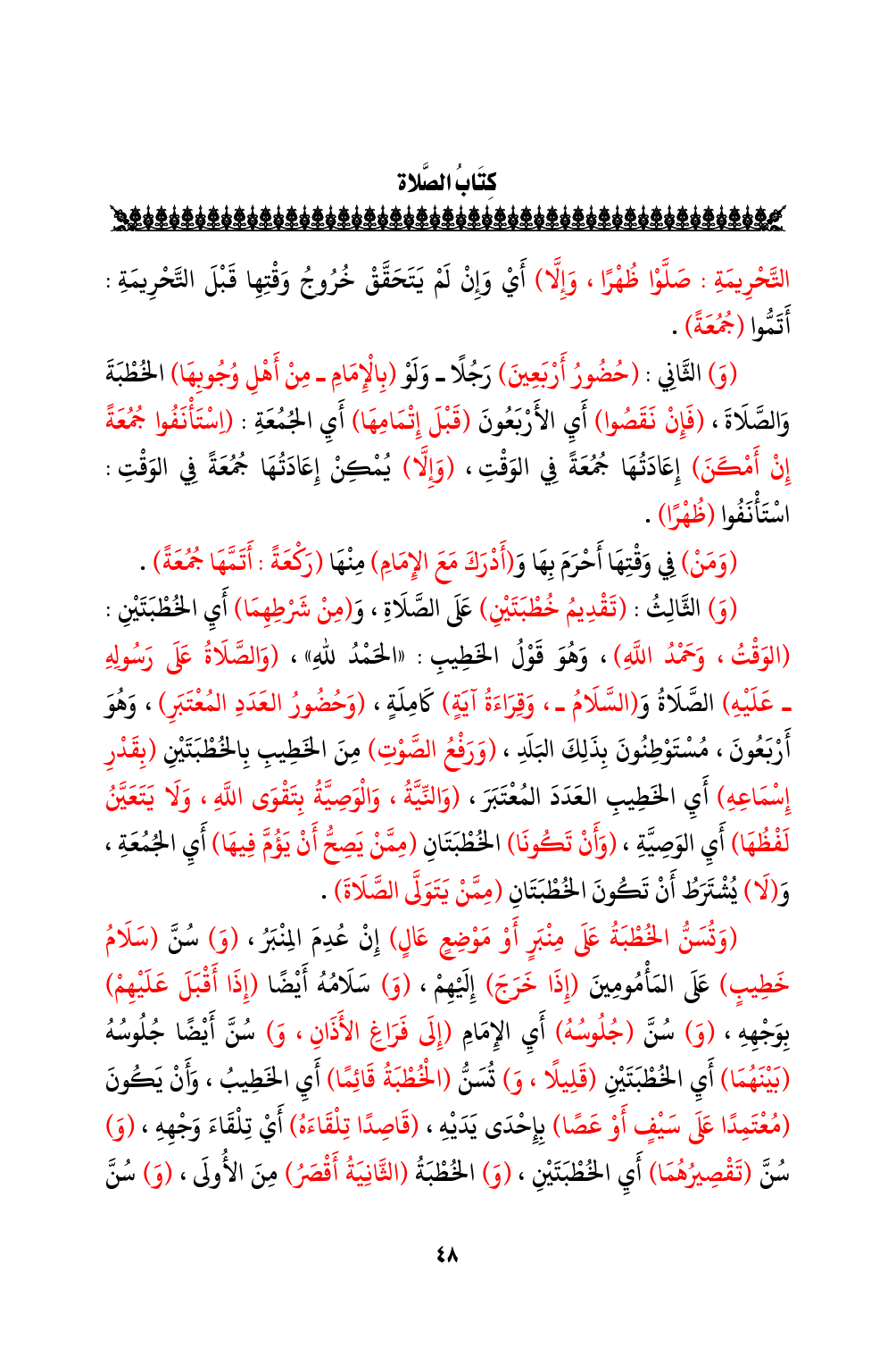 (وَ) الثَّالِثُ: (تَقْدِيمُ خُطْبَتَيْنِ) عَلَى الصَّلَاةِ، وَ (مِنْ شَرْطِهِمَا) أَيِ الخُطْبَتَيْنِ: (الوَقْتُ، وَحَمْدُ اللَّهِ)، وَهُوَ قَوْلُ الخَطِيبِ: «الحَمْدُ للهِ»، (وَالصَّلَاةُ عَلَى رَسُولِهِ - عَلَيْهِ) الصَّلَاةُ وَ (السَّلَامُ -، وَقِرَاءَةُ آيَةٍ) كَامِلَةٍ، (وَحُضُورُ العَدَدِ المُعْتَبَرِ)، وَهُوَ أَرْبَعُونَ، مُسْتَوْطِنُونَ بِذَلِكَ البَلَدِ، (وَرَفْعُ الصَّوْتِ) مِنَ الخَطِيبِ بِالخُطْبَتَيْنِ (بِقَدْرِ إِسْمَاعِهِ) أَيِ الخَطِيبِ العَدَدَ المُعْتَبَرَ، (وَالنِّيَّةُ، وَالْوَصِيَّةُ بِتَقْوَى اللَّهِ، وَلَا يَتَعَيَّنُ لَفْظُهَا) أَيِ الوَصِيَّةِ، (وَأَنْ تَكُونَا) الخُطْبَتَانِ (مِمَّنْ يَصِحُّ أَنْ يَؤُمَّ فِيهَا) أَيِ الجُمُعَةِ، وَ (لَا) يُشْتَرَطُ أَنْ تَكُونَ الخُطْبَتَانِ (مِمَّنْ يَتَوَلَّى الصَّلَاةَ).
