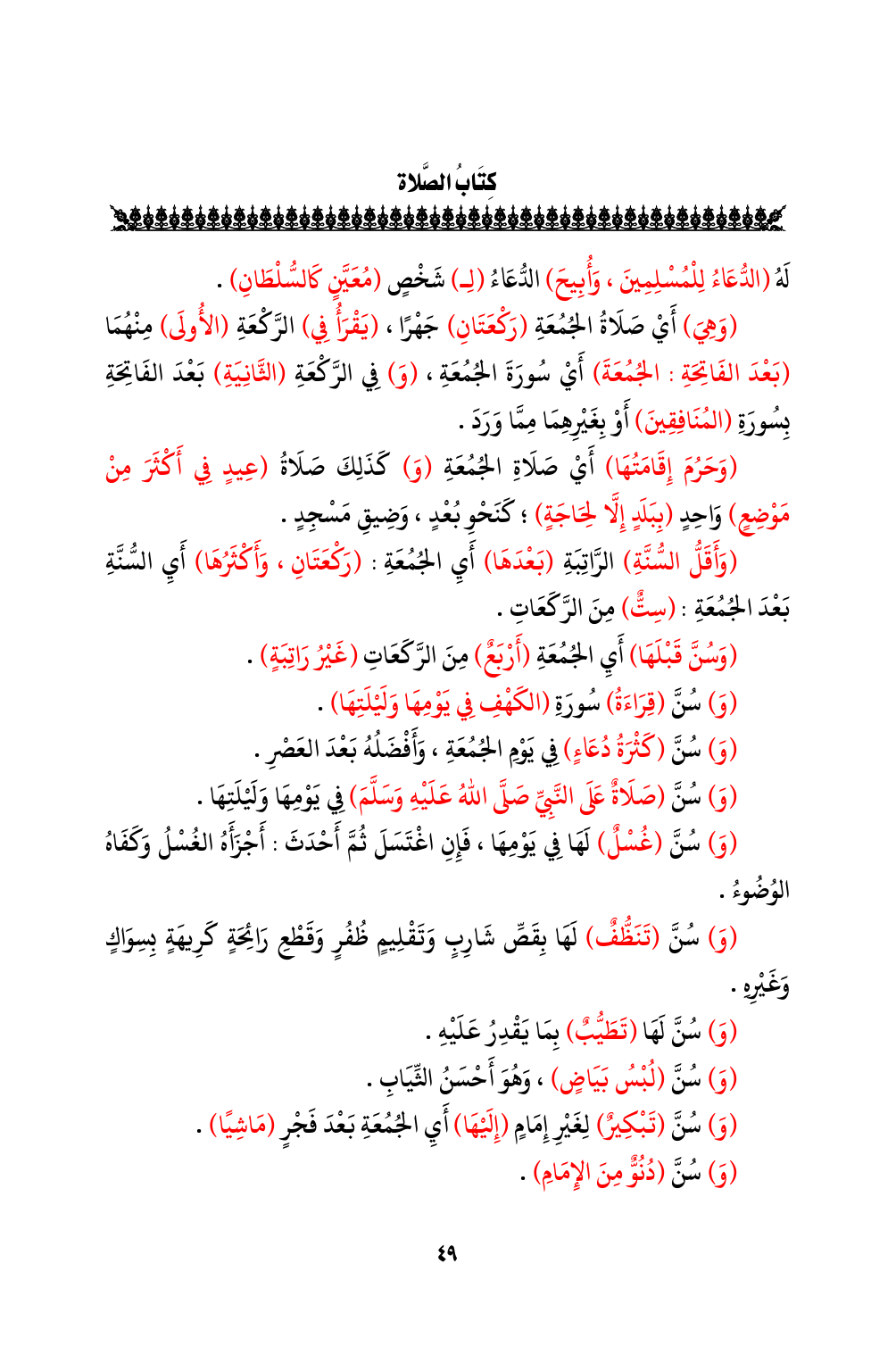 (وَ) سُنَّ (صَلَاةٌ عَلَى النَّبِيِّ صَلَّى اللهُ عَلَيْهِ وَسَلَّمَ) فِي يَوْمِهَا وَلَيْلَتِهَا.